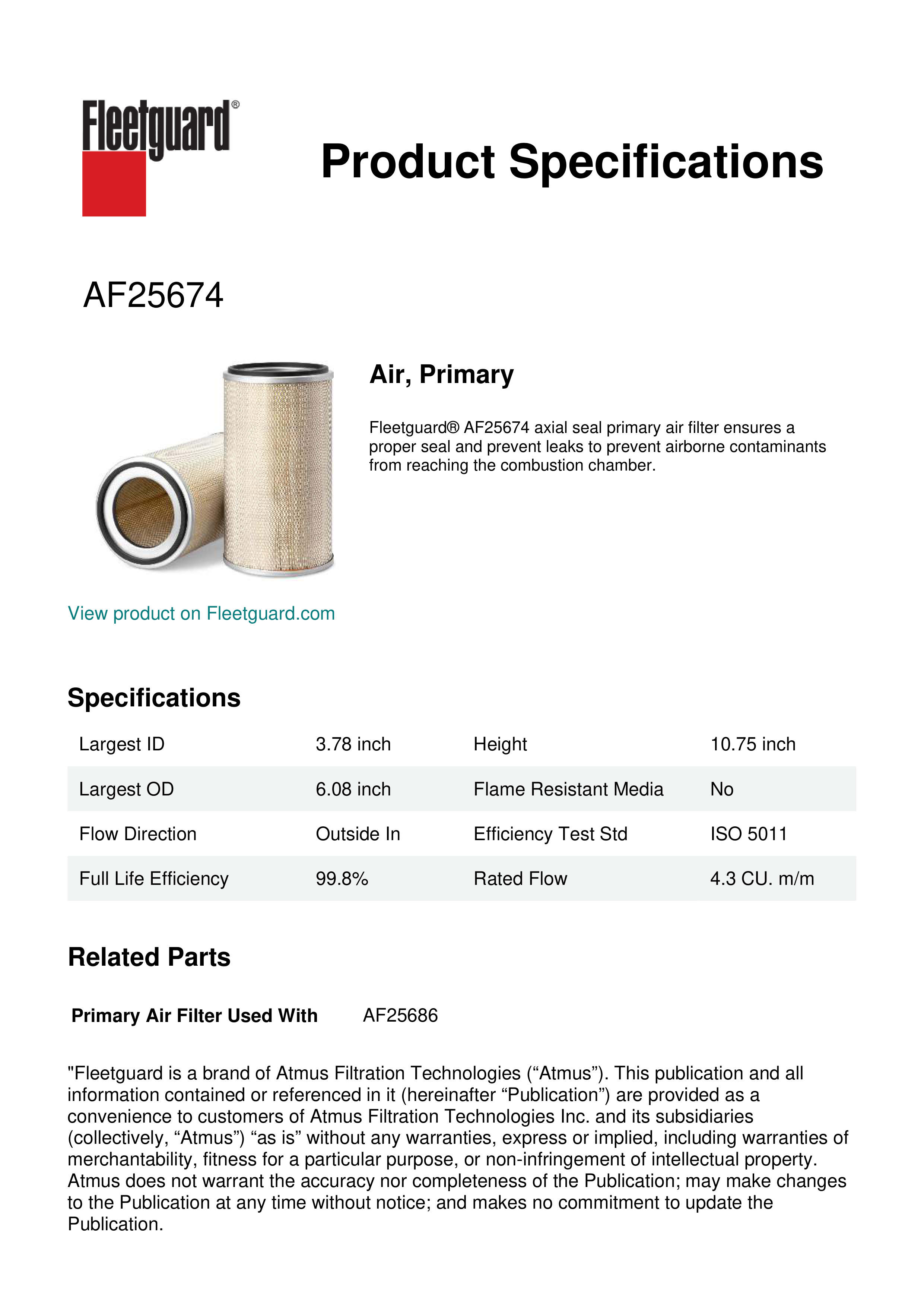 Fleetguard® AF25674 axial seal primary air filter ensures a proper seal and prevent leaks to prevent airborne contaminants from reaching the combustion chamber.Specification