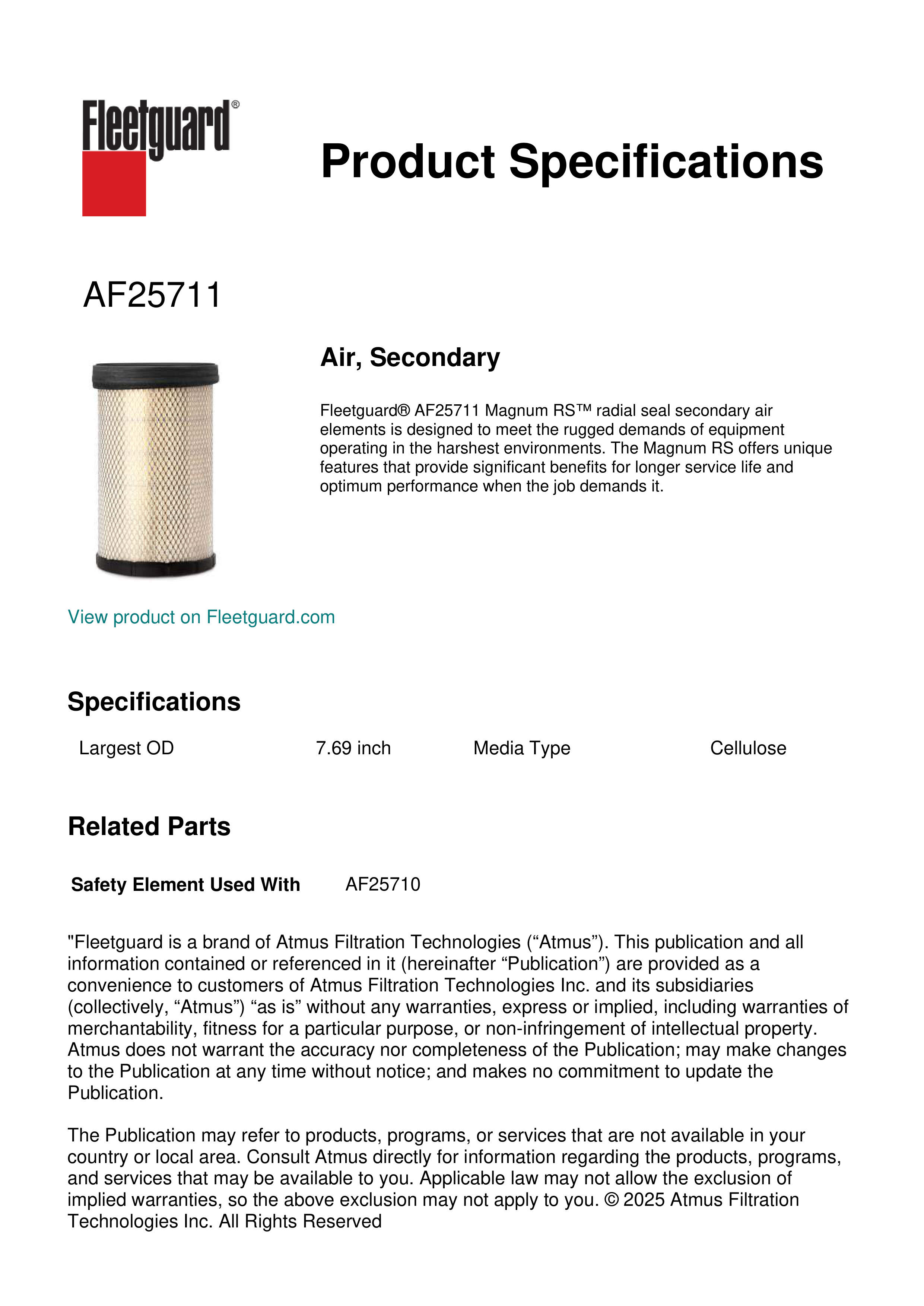 Fleetguard® AF25711 Magnum RS™ radial seal secondary air elements is designed to meet the rugged demands of equipment operating in the harshest environments. The Magnum RS offers unique features that provide significant benefits for longer service life and optimum performance when the job demands it.Specification