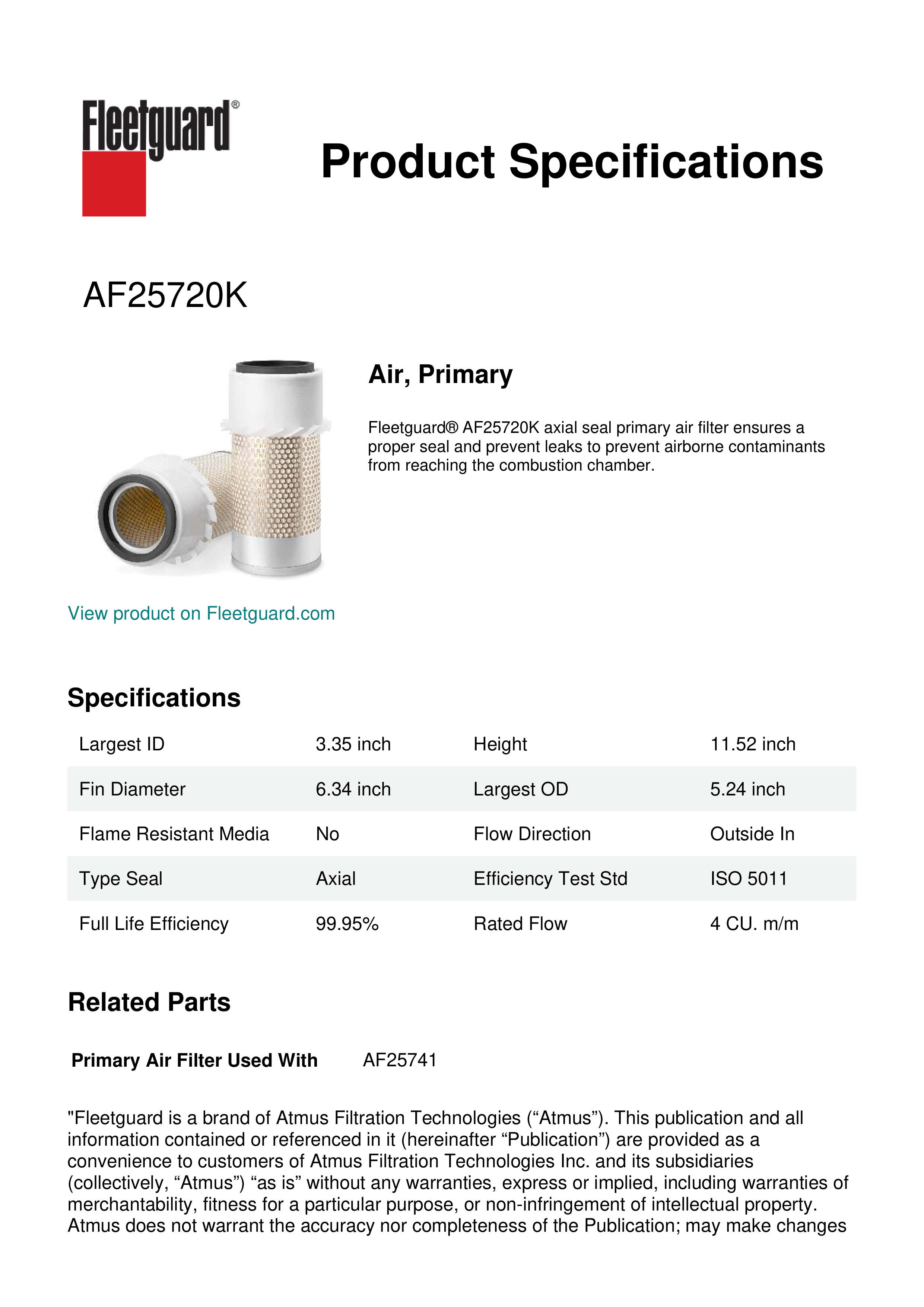 Fleetguard® AF25720K axial seal primary air filter ensures a proper seal and prevent leaks to prevent airborne contaminants from reaching the combustion chamber.Specification