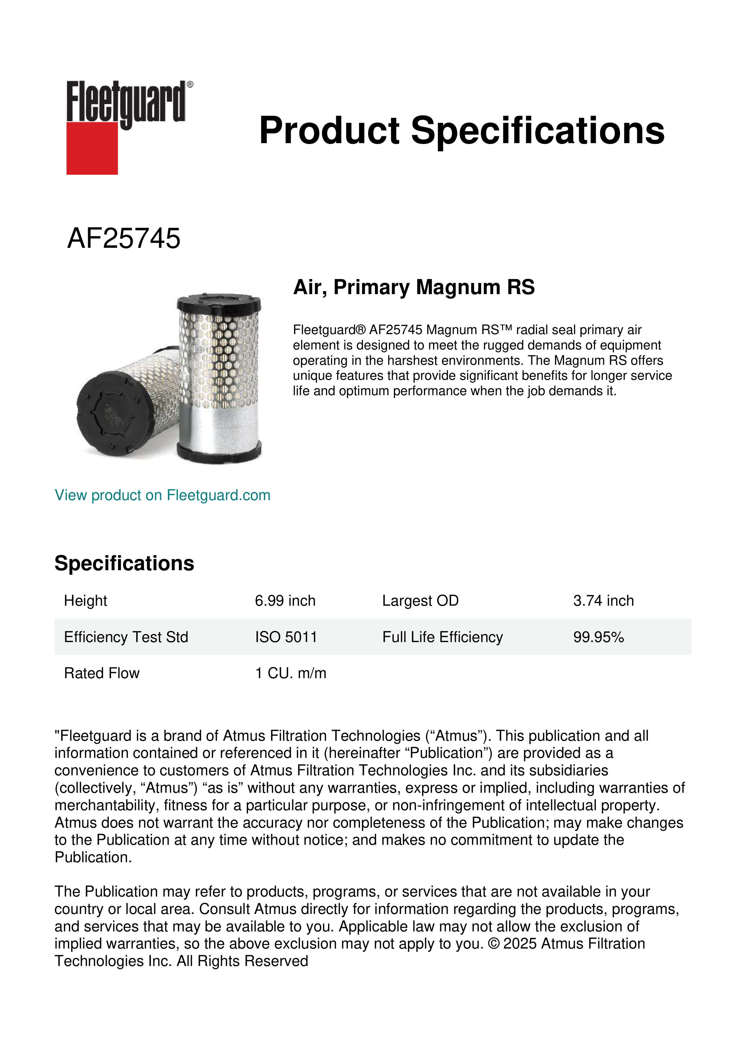 Fleetguard® AF25745 Magnum RS™ radial seal primary air element is designed to meet the rugged demands of equipment operating in the harshest environments. The Magnum RS offers unique features that provide significant benefits for longer service life and optimum performance when the job demands it.Specification