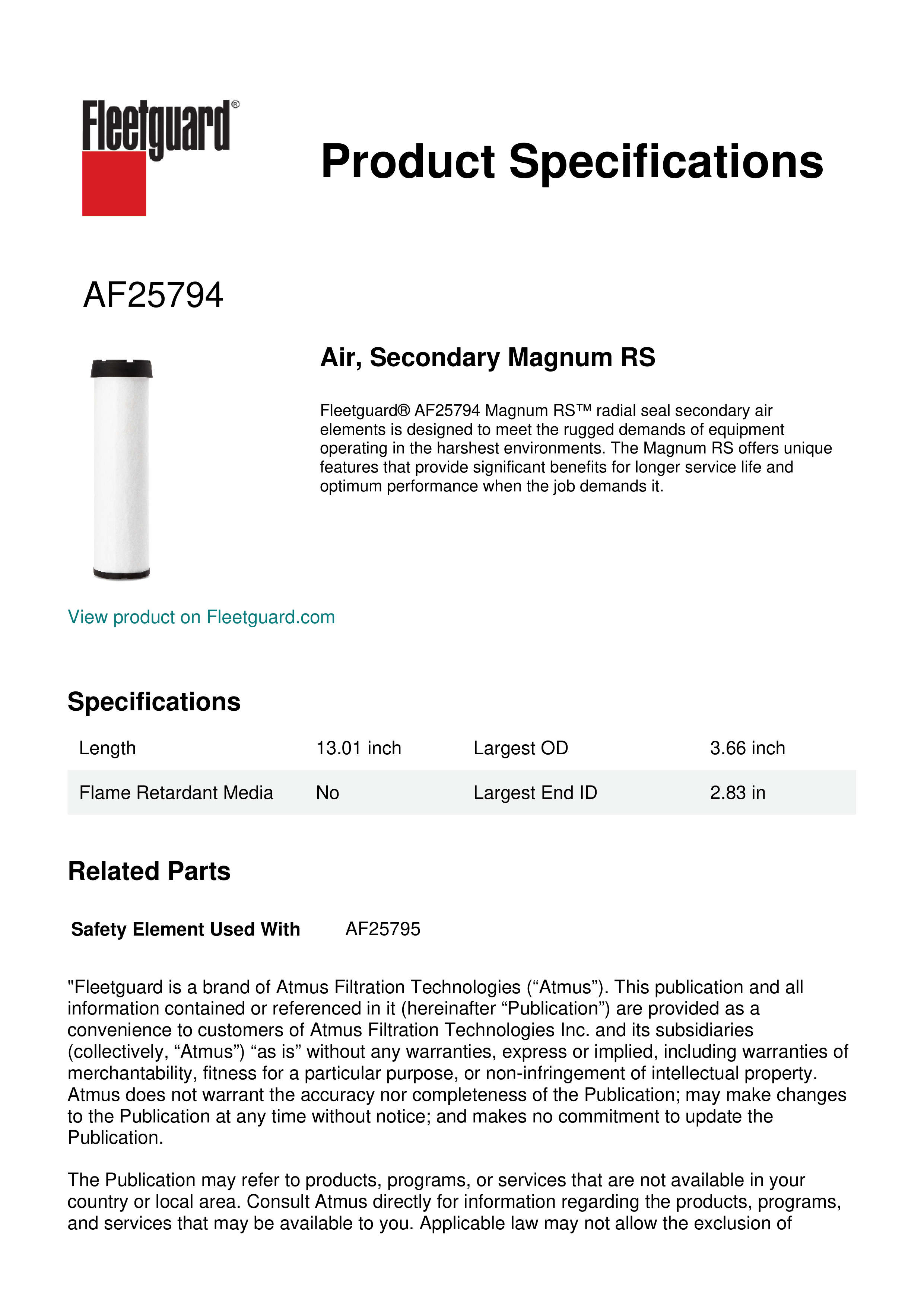 Fleetguard® AF25794 Magnum RS™ radial seal secondary air elements is designed to meet the rugged demands of equipment operating in the harshest environments. The Magnum RS offers unique features that provide significant benefits for longer service life and optimum performance when the job demands it.Specification