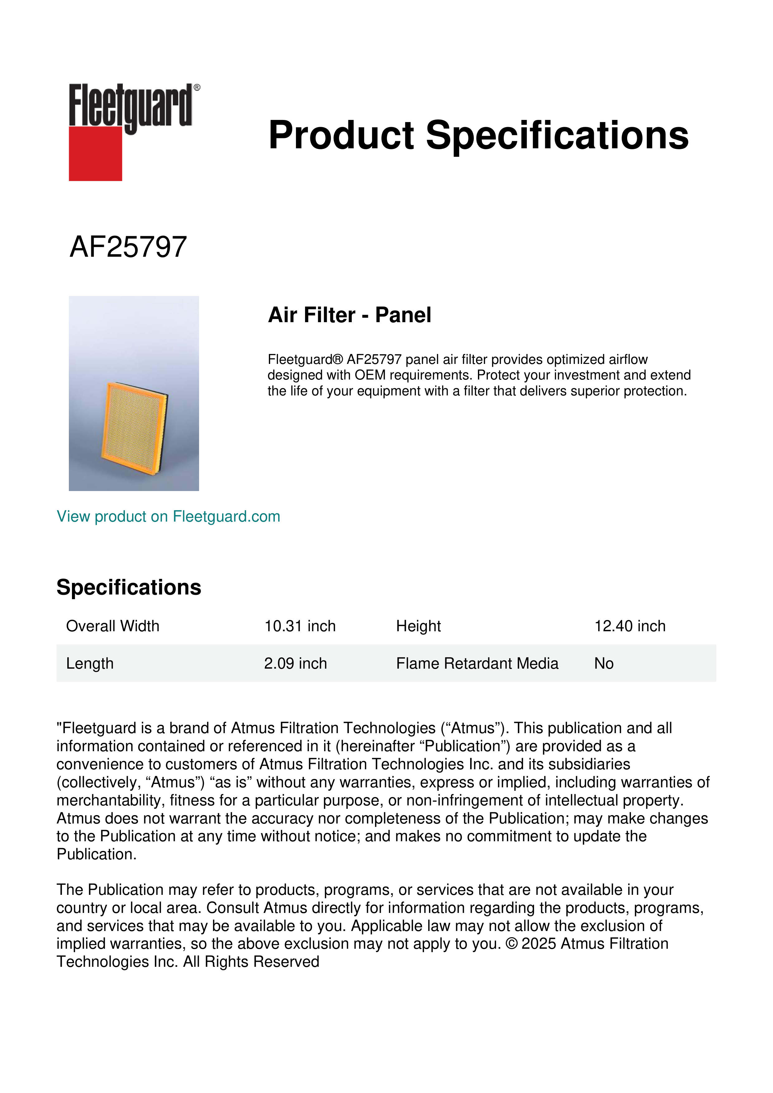 Fleetguard® AF25797 panel air filter provides optimized airflow designed with OEM requirements. Protect your investment and extend the life of your equipment with a filter that delivers superior protection.Specification