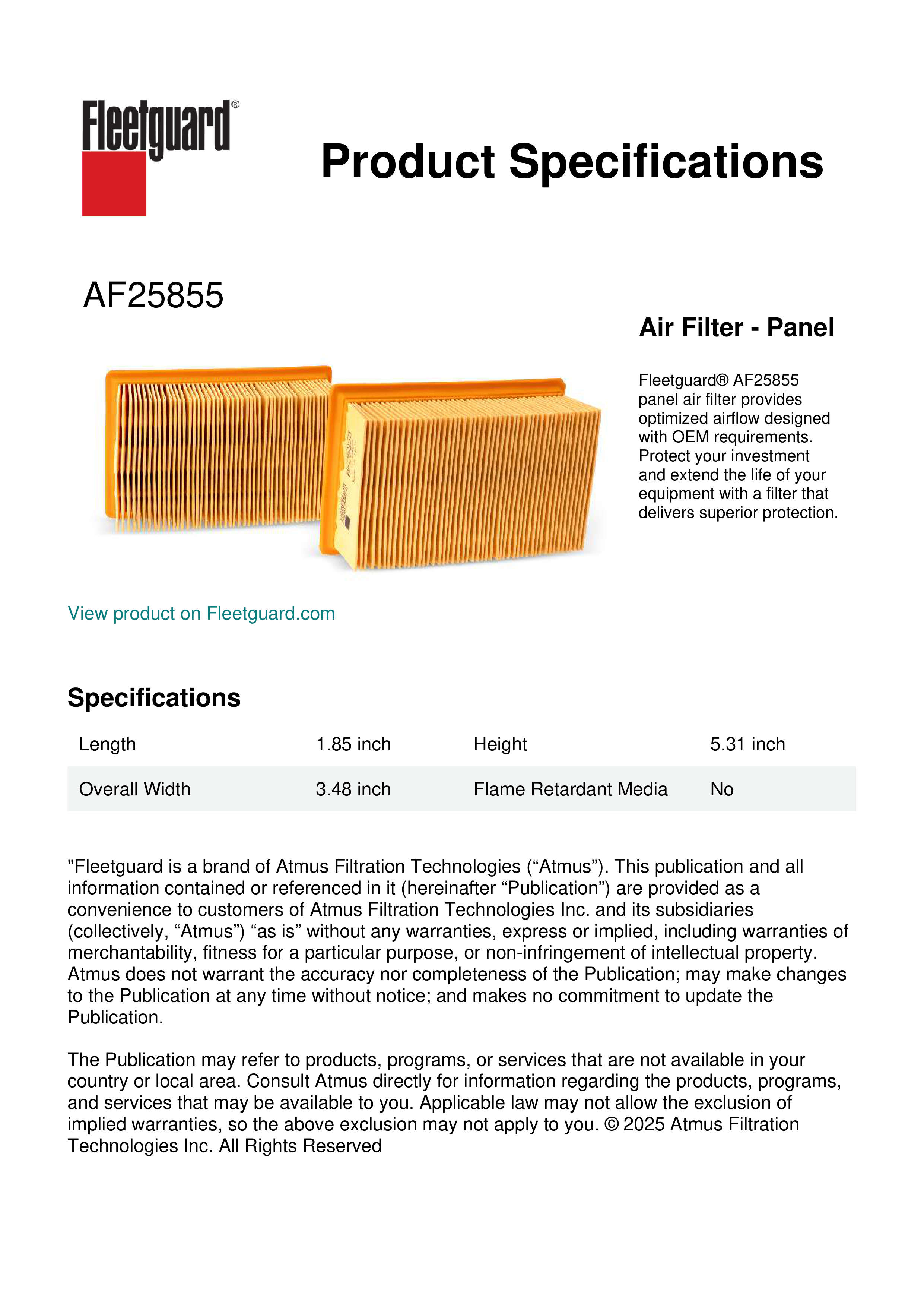 Fleetguard® AF25855 panel air filter provides optimized airflow designed with OEM requirements. Protect your investment and extend the life of your equipment with a filter that delivers superior protection.Specification