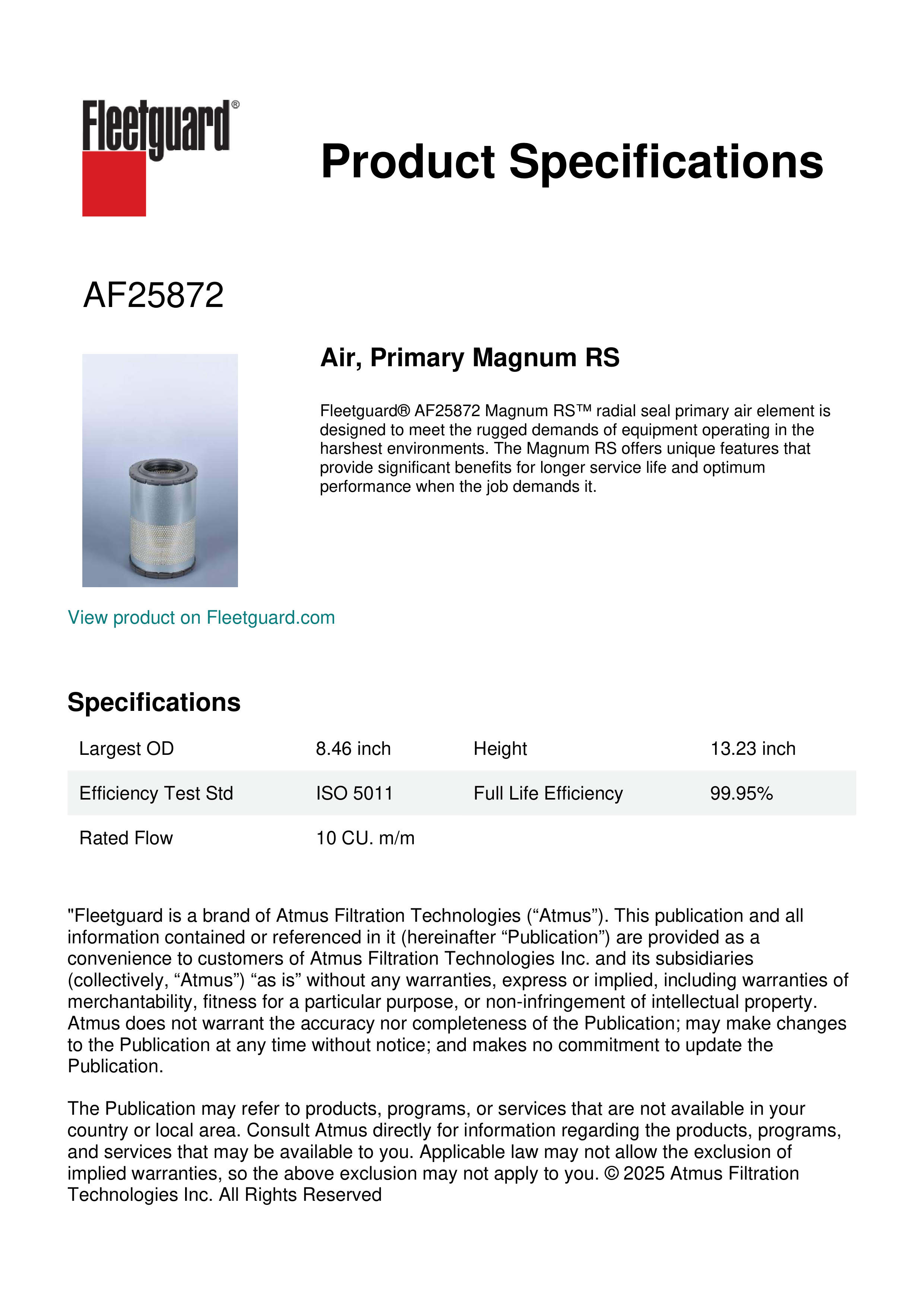 Fleetguard® AF25872 Magnum RS™ radial seal primary air element is designed to meet the rugged demands of equipment operating in the harshest environments. The Magnum RS offers unique features that provide significant benefits for longer service life and optimum performance when the job demands it.Specification