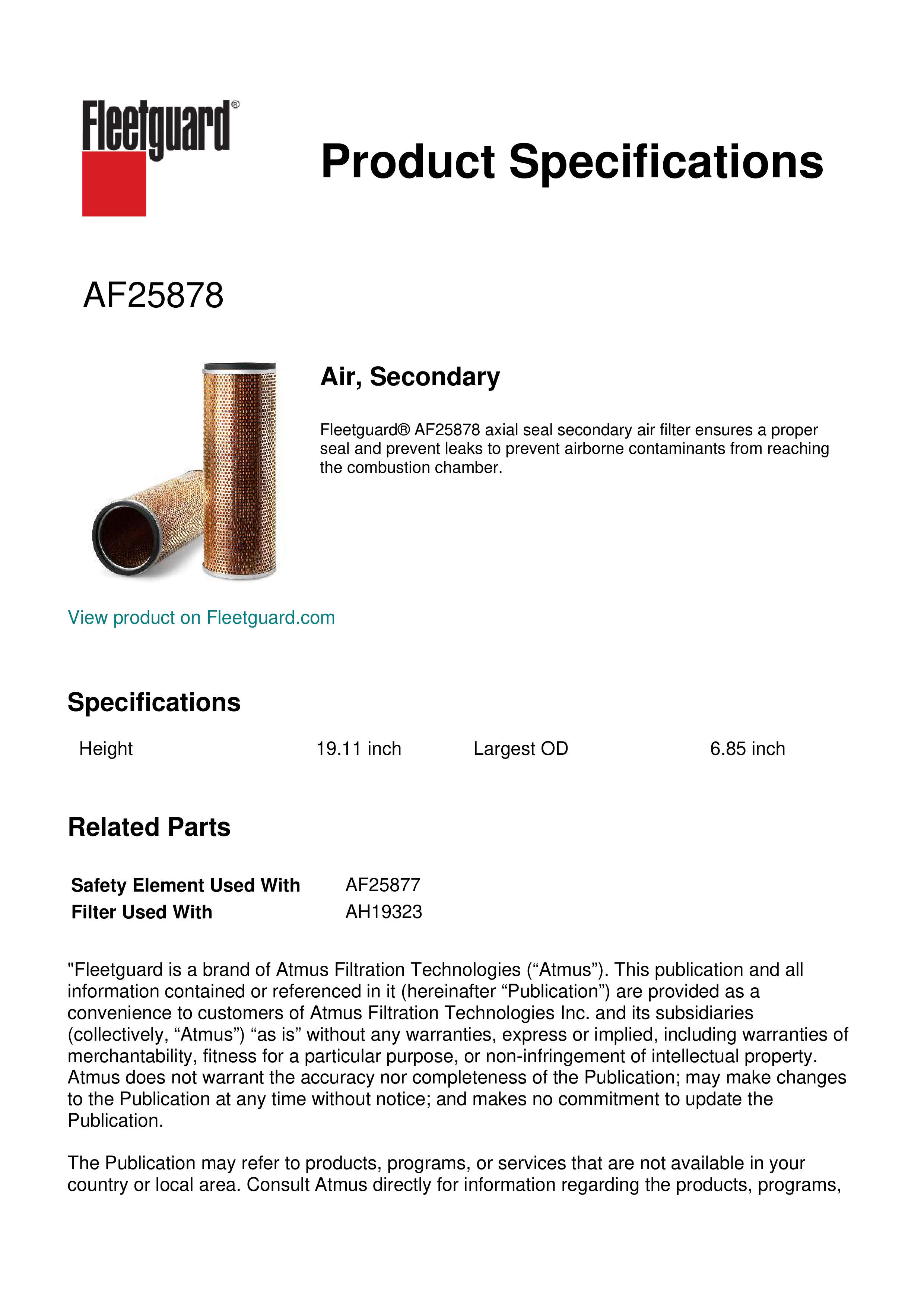 Fleetguard® AF25878 axial seal secondary air filter ensures a proper seal and prevent leaks to prevent airborne contaminants from reaching the combustion chamber.