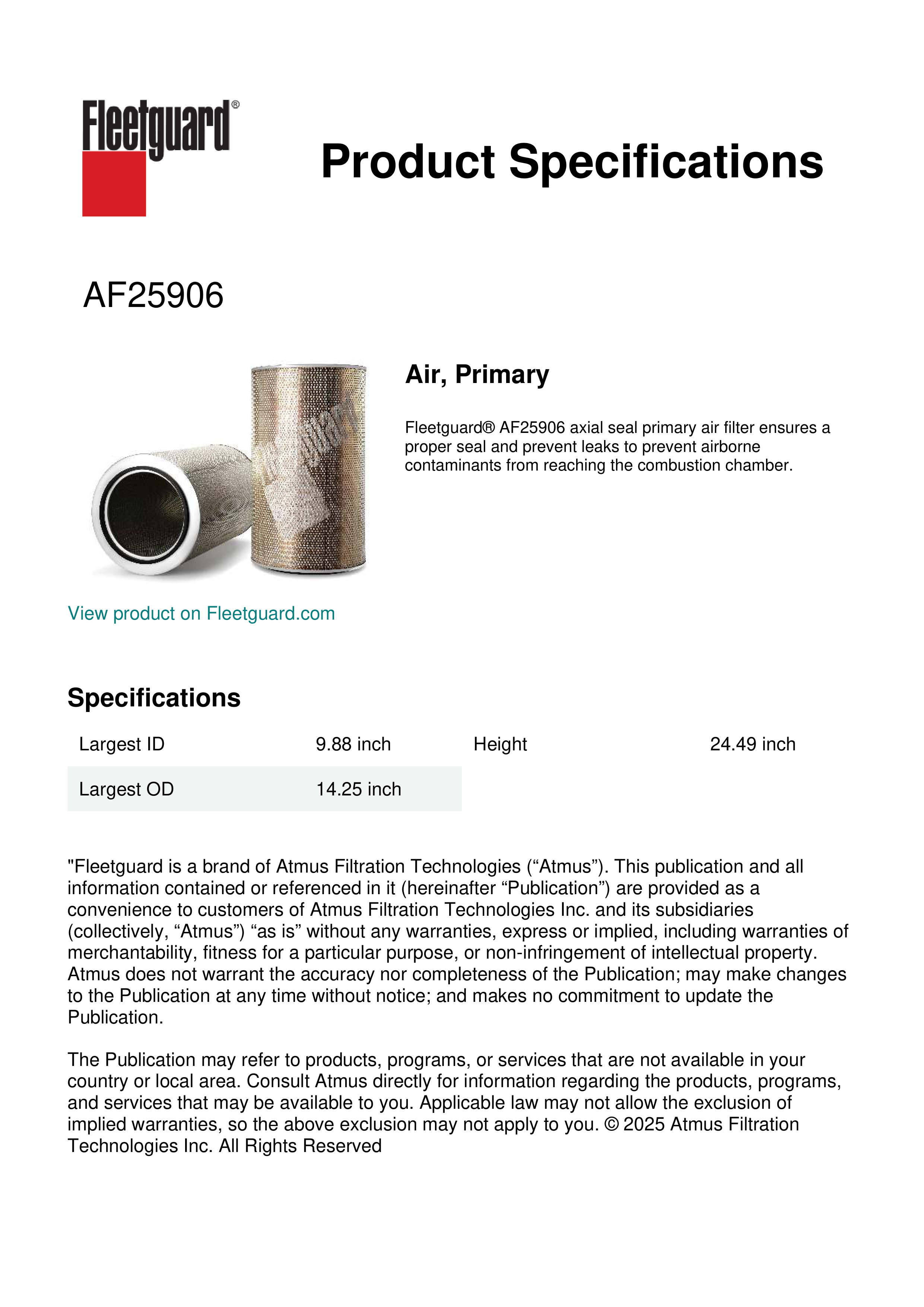 Fleetguard® AF25906 axial seal primary air filter ensures a proper seal and prevent leaks to prevent airborne contaminants from reaching the combustion chamber.