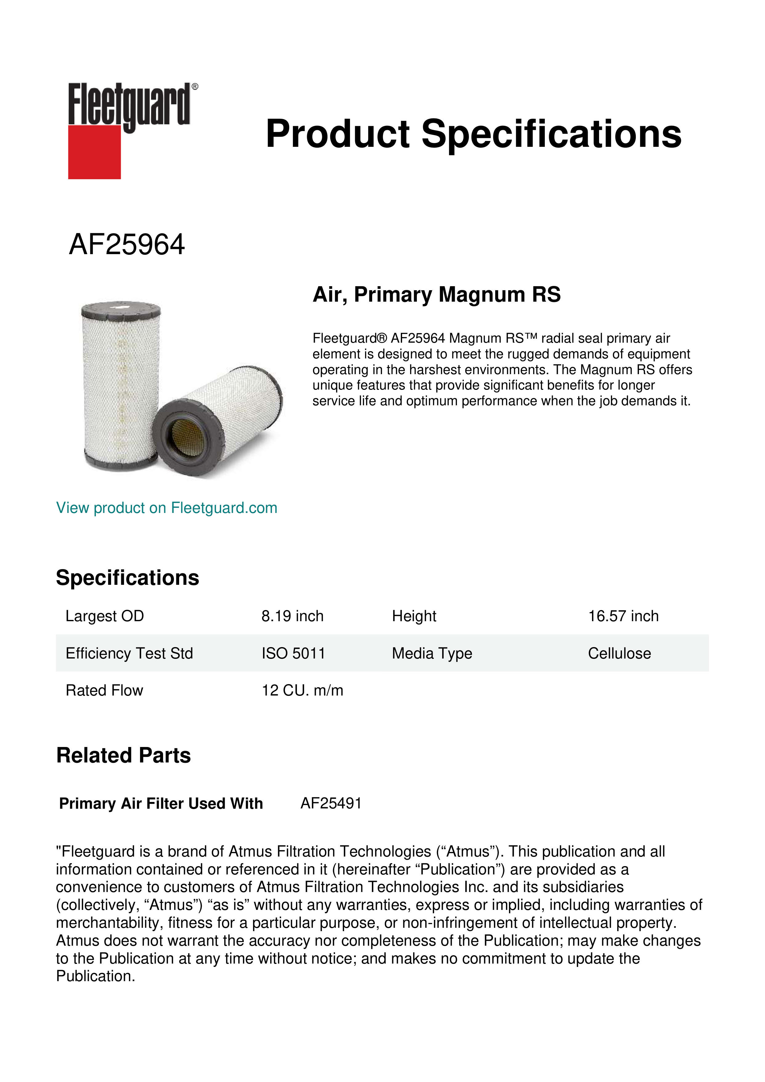 Fleetguard® AF25964 Magnum RS™ radial seal primary air element is designed to meet the rugged demands of equipment operating in the harshest environments. The Magnum RS offers unique features that provide significant benefits for longer service life and optimum performance when the job demands it.Specification