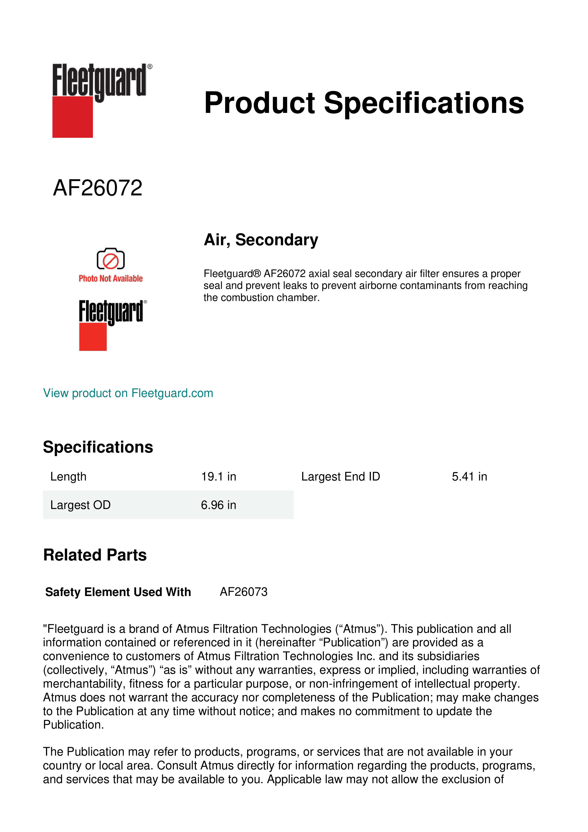 Fleetguard® AF26072 axial seal secondary air filter ensures a proper seal and prevent leaks to prevent airborne contaminants from reaching the combustion chamber.Specification