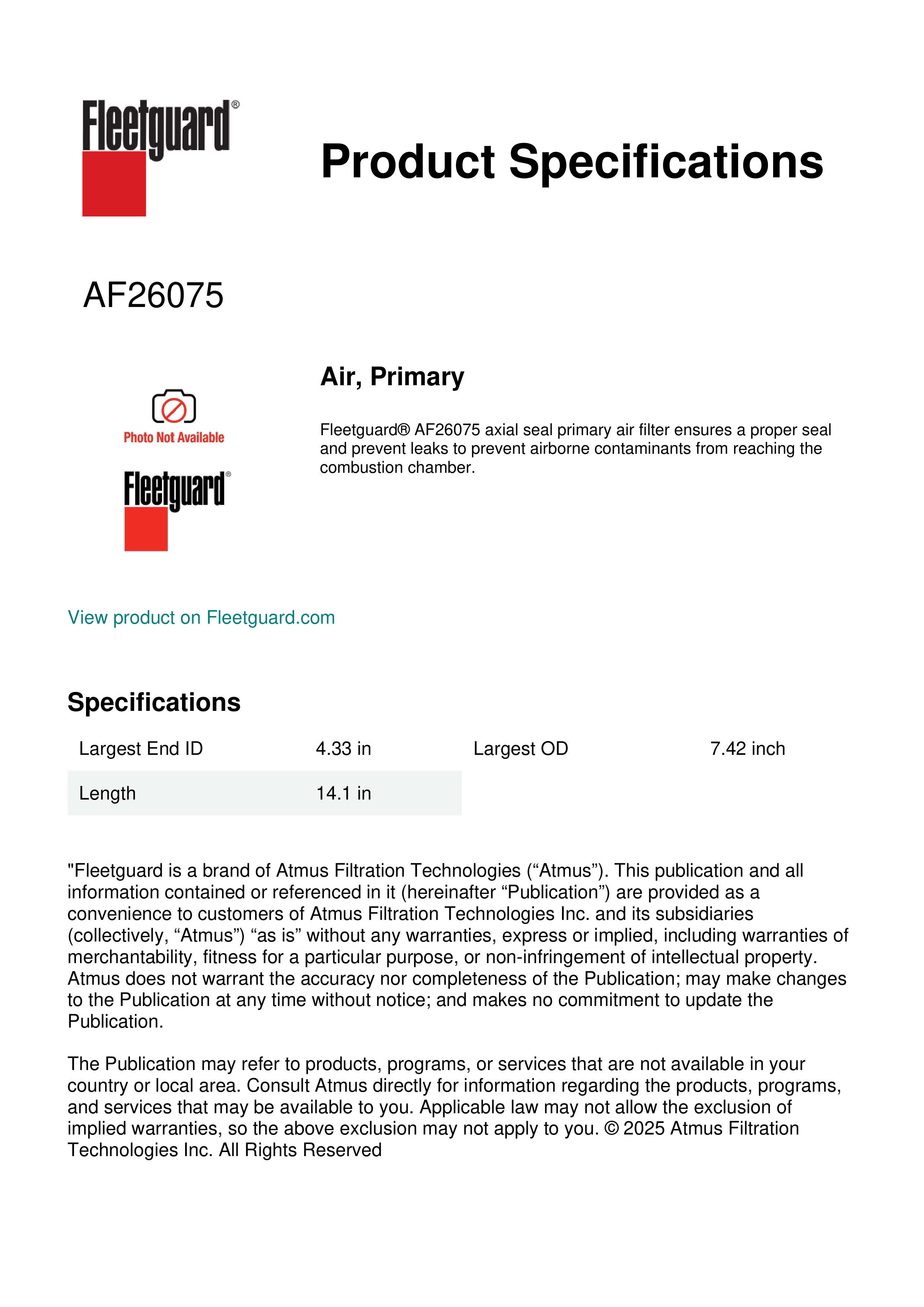Fleetguard® AF26075 axial seal primary air filter ensures a proper seal and prevent leaks to prevent airborne contaminants from reaching the combustion chamber.Specification