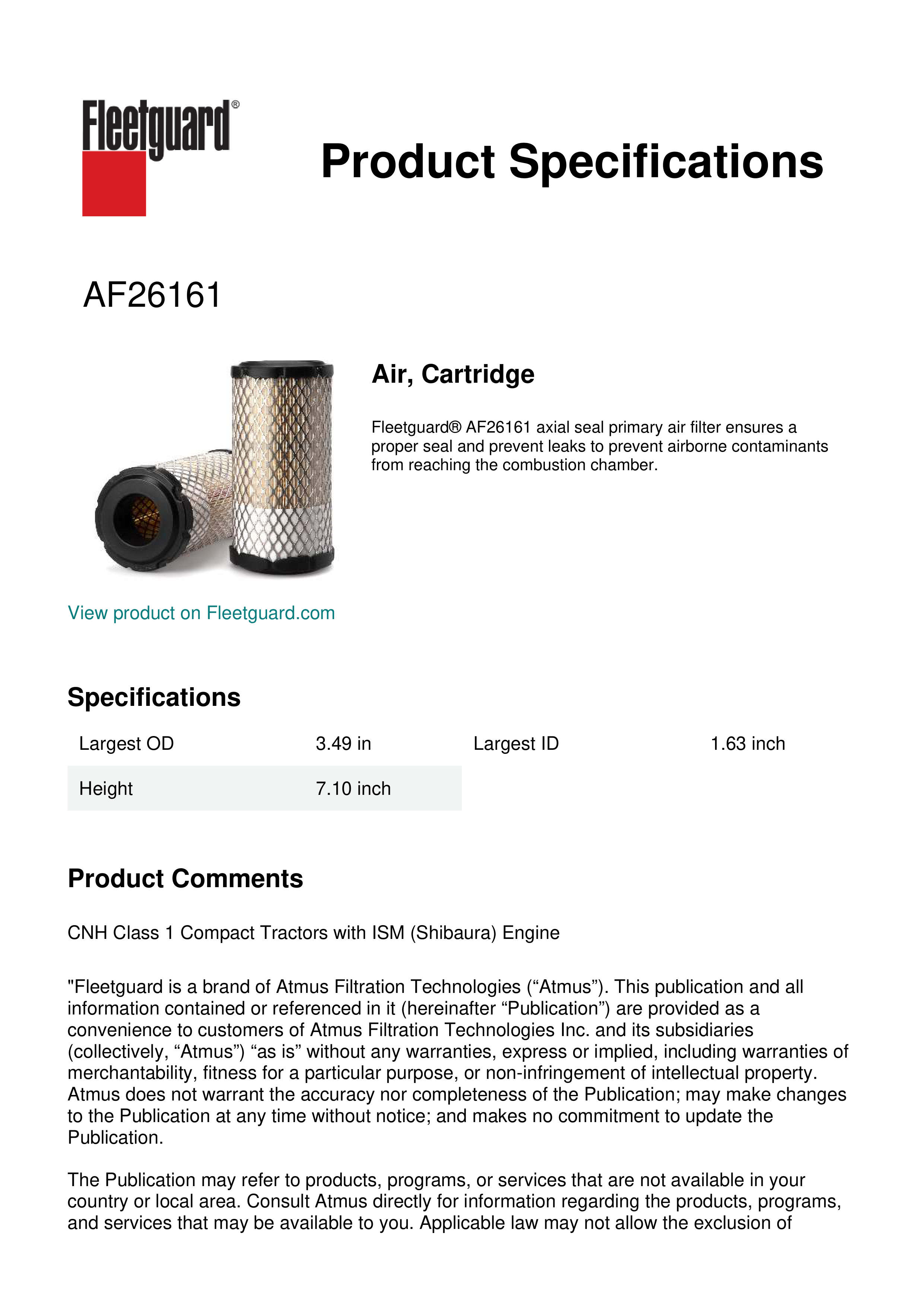 Fleetguard® AF26161 axial seal primary air filter ensures a proper seal and prevent leaks to prevent airborne contaminants from reaching the combustion chamber.Specification
