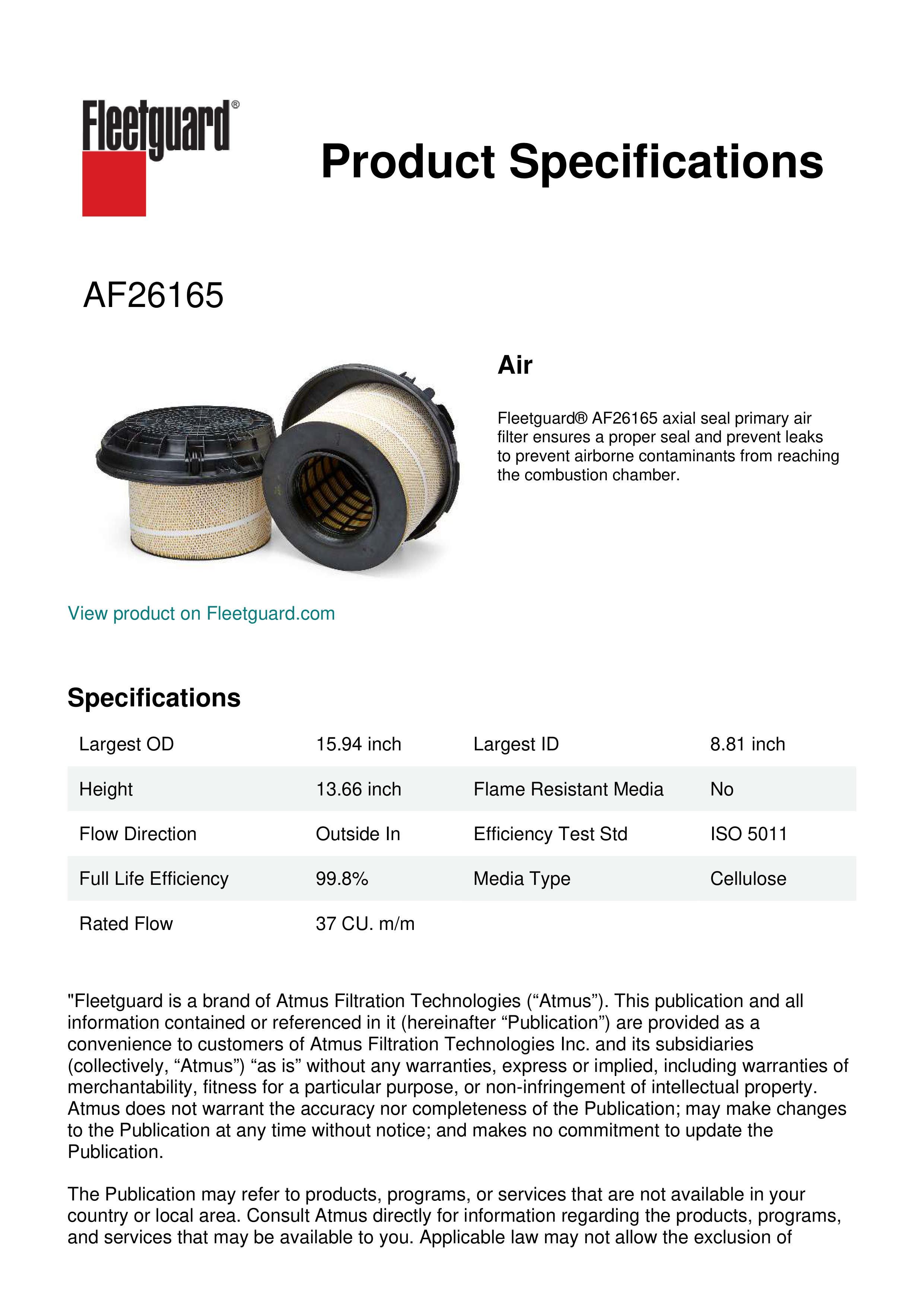 Fleetguard® AF26165 axial seal primary air filter ensures a proper seal and prevent leaks to prevent airborne contaminants from reaching the combustion chamber.