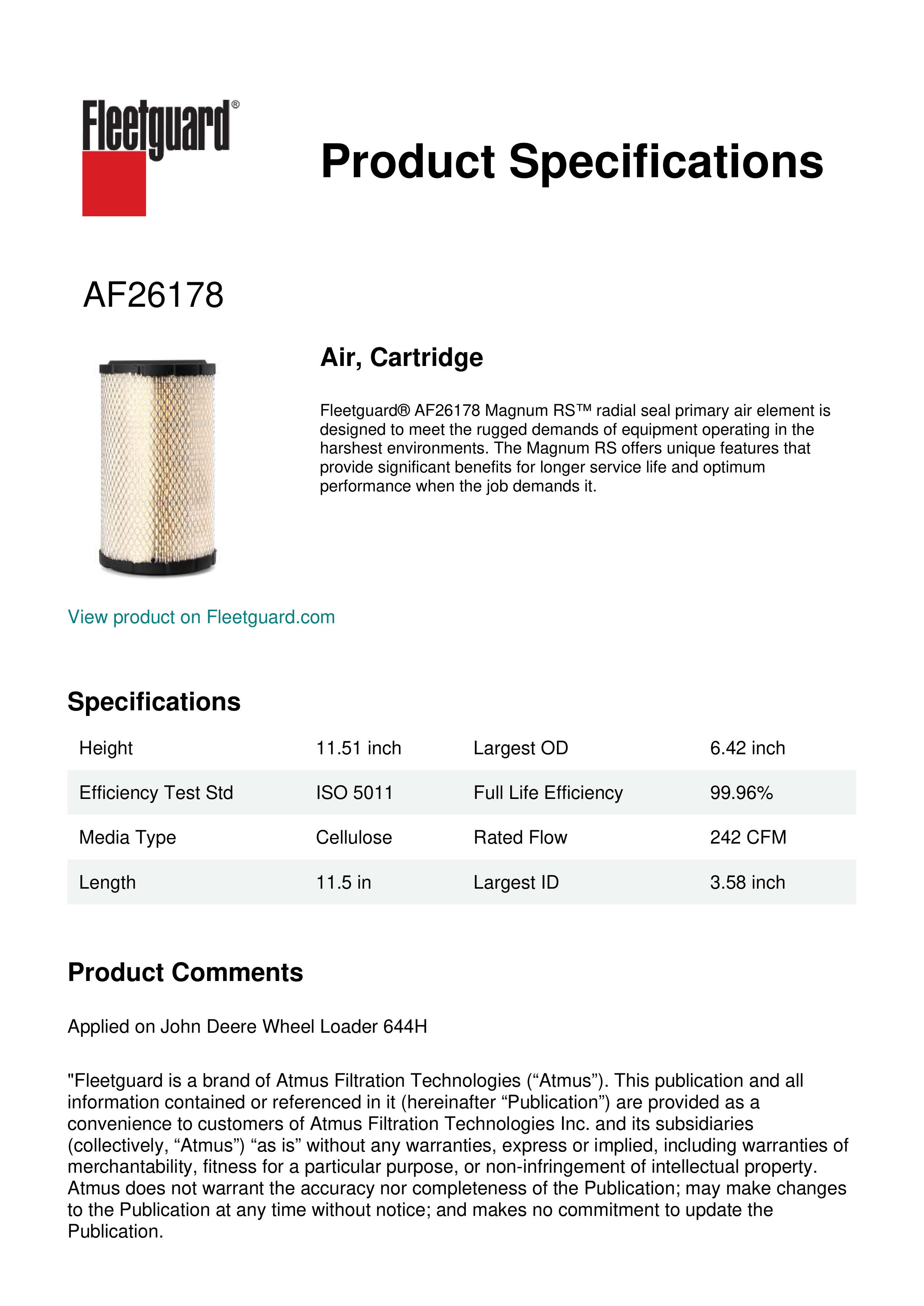 Fleetguard® AF26178 Magnum RS™ radial seal primary air element is designed to meet the rugged demands of equipment operating in the harshest environments. The Magnum RS offers unique features that provide significant benefits for longer service life and optimum performance when the job demands it.