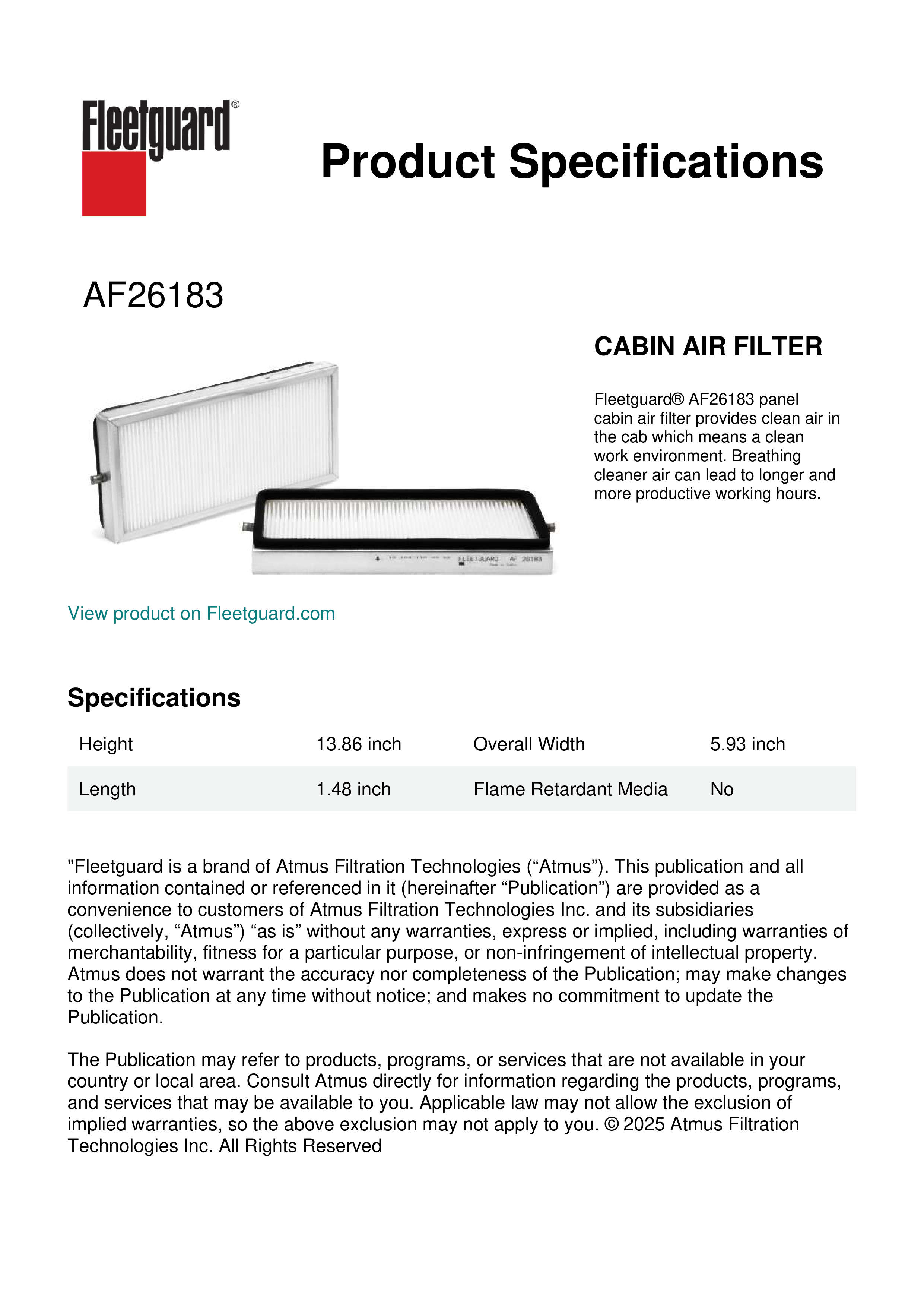 Fleetguard® AF26183 panel cabin air filter provides clean air in the cab which means a clean work environment. Breathing cleaner air can lead to longer and more productive working hours.Specification