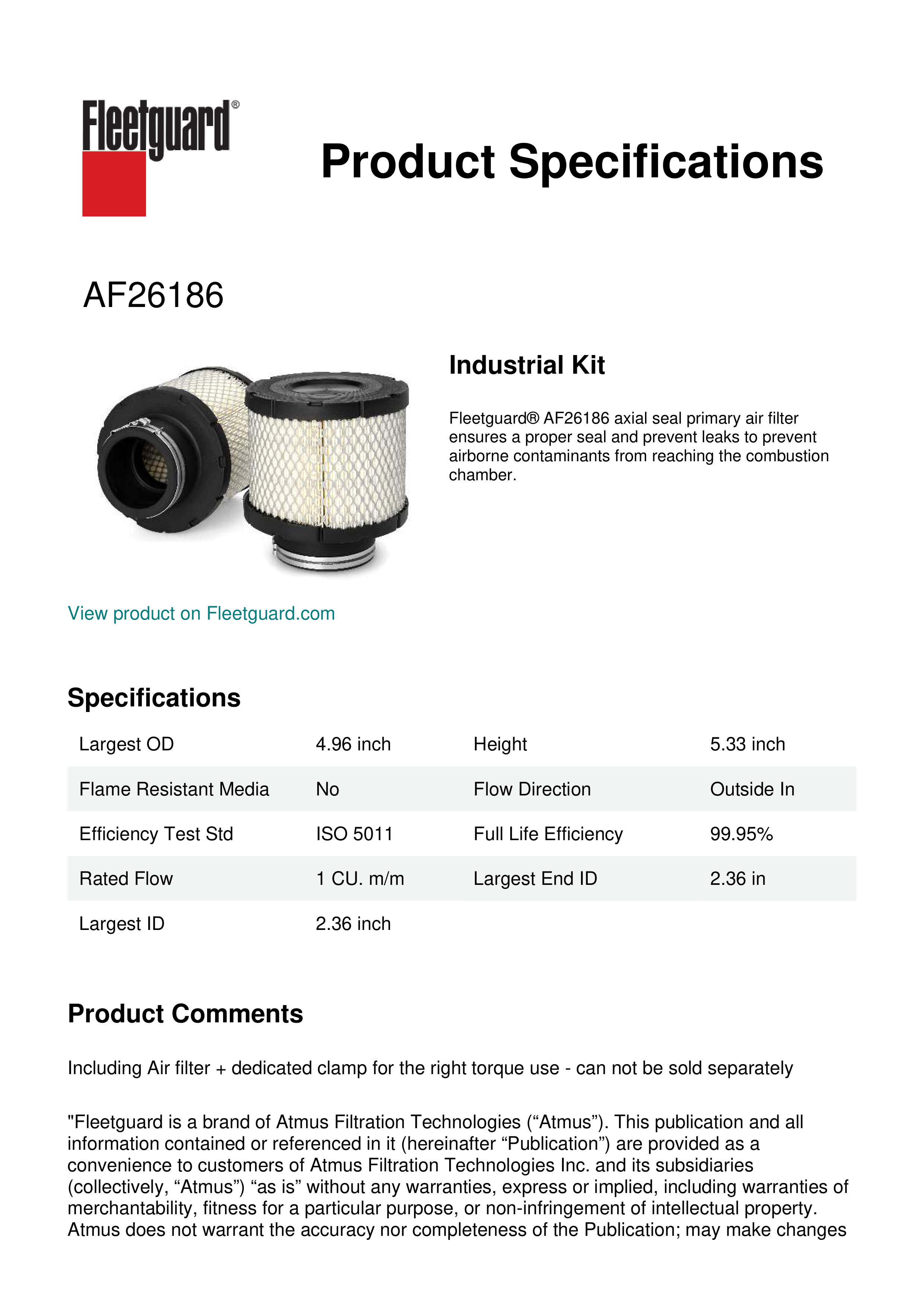 Fleetguard® AF26186 axial seal primary air filter ensures a proper seal and prevent leaks to prevent airborne contaminants from reaching the combustion chamber.Specification