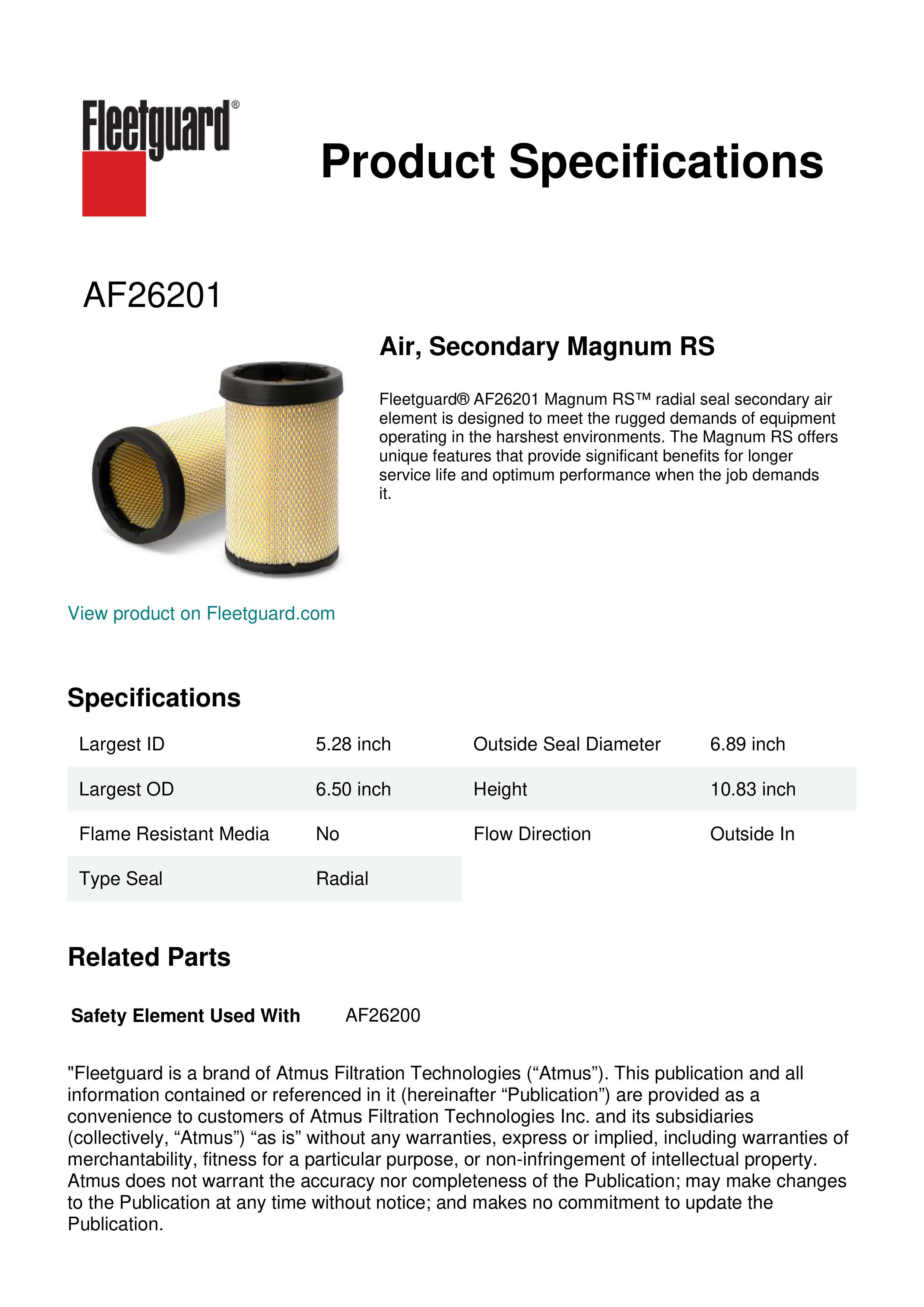 Fleetguard® AF26201 Magnum RS™ radial seal secondary air element is designed to meet the rugged demands of equipment operating in the harshest environments. The Magnum RS offers unique features that provide significant benefits for longer service life and optimum performance when the job demands it.Specification