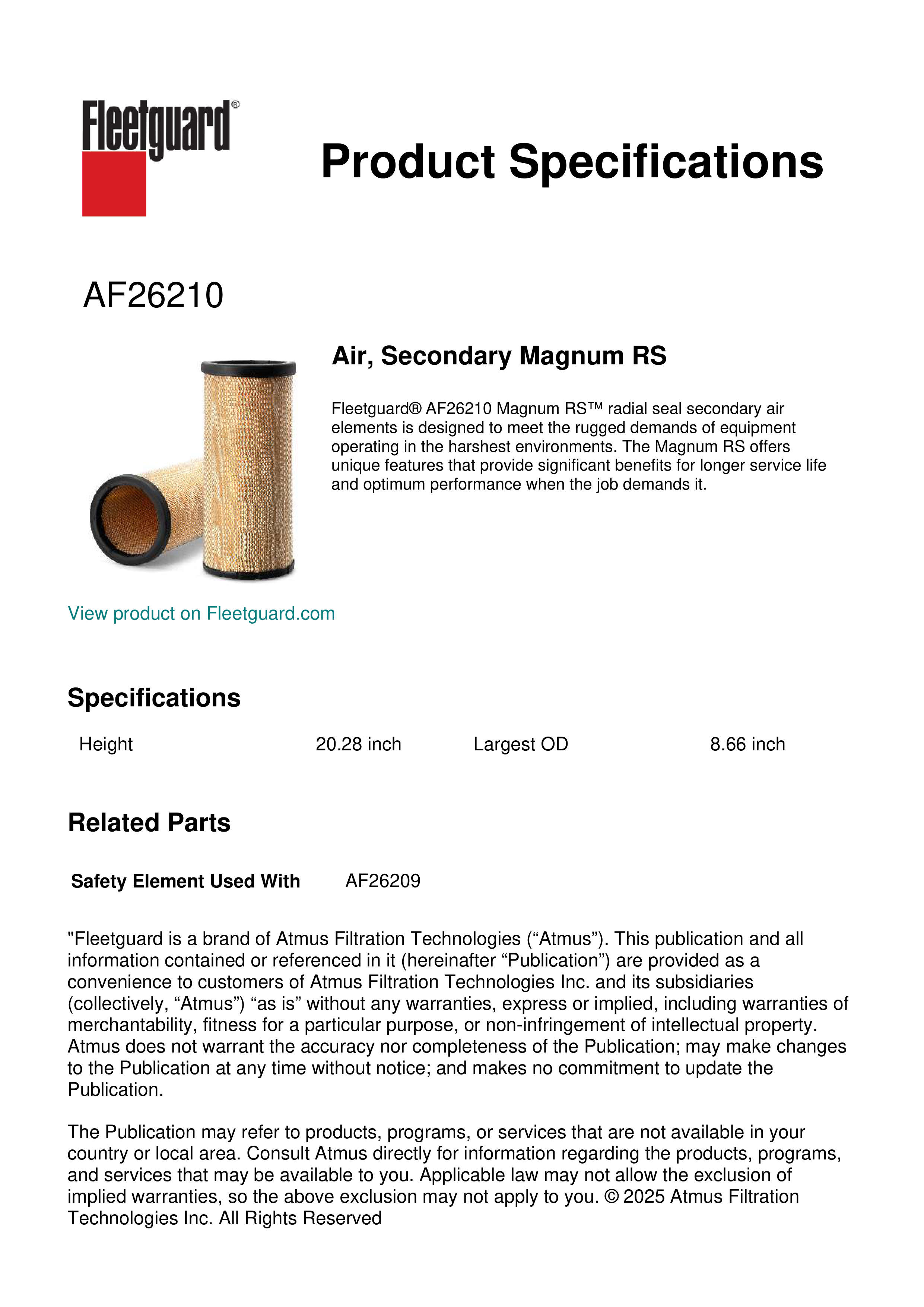 Fleetguard® AF26210 Magnum RS™ radial seal secondary air elements is designed to meet the rugged demands of equipment operating in the harshest environments. The Magnum RS offers unique features that provide significant benefits for longer service life and optimum performance when the job demands it.Specification