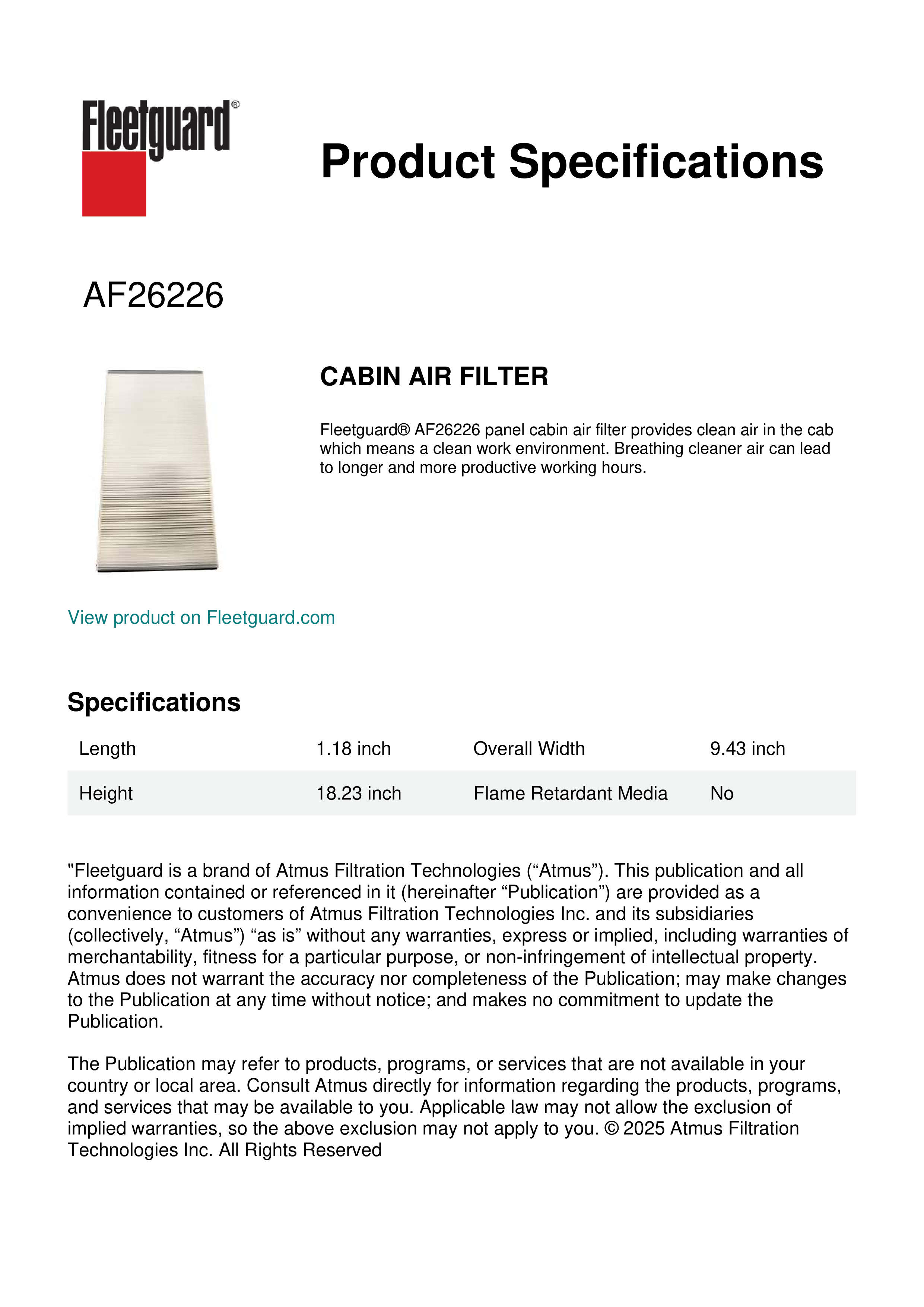 Fleetguard® AF26226 panel cabin air filter provides clean air in the cab which means a clean work environment. Breathing cleaner air can lead to longer and more productive working hours.Specification