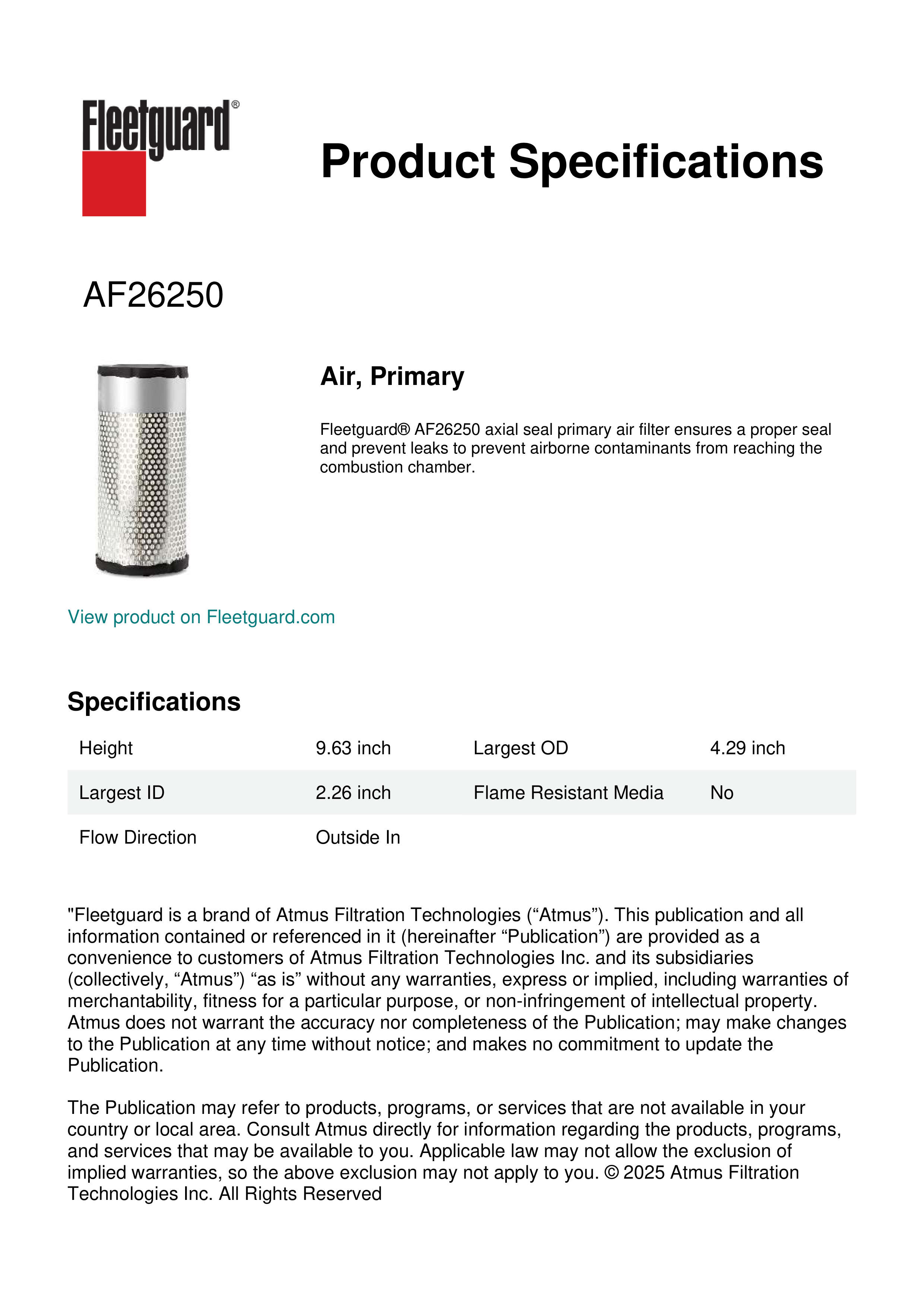 Fleetguard® AF26250 axial seal primary air filter ensures a proper seal and prevent leaks to prevent airborne contaminants from reaching the combustion chamber.Specification