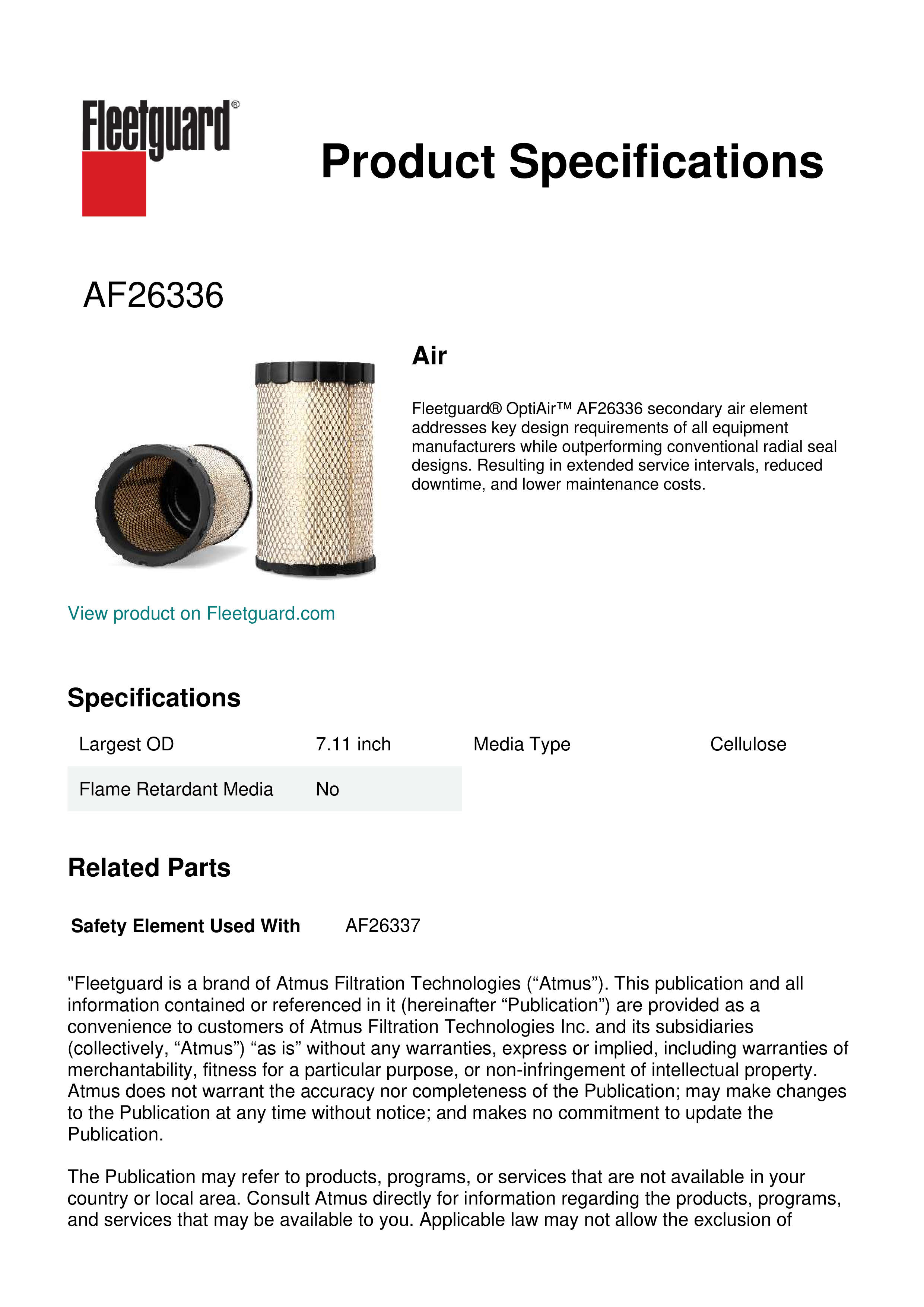 Fleetguard® OptiAir™ AF26336 secondary air element addresses key design requirements of all equipment manufacturers while outperforming conventional radial seal designs. Resulting in extended service intervals, reduced downtime, and lower maintenance costs.Specification