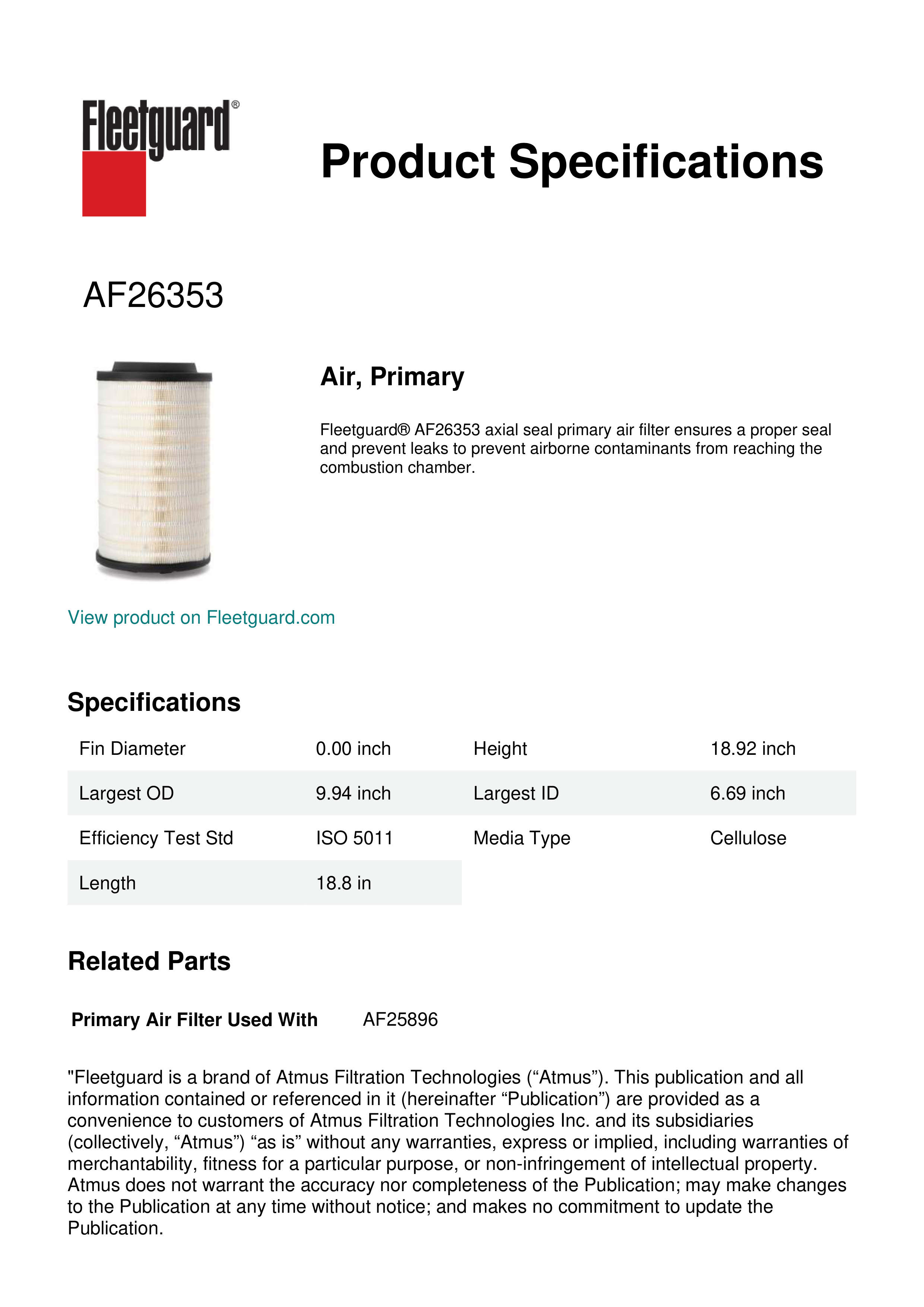 Fleetguard® AF26353 axial seal primary air filter ensures a proper seal and prevent leaks to prevent airborne contaminants from reaching the combustion chamber.