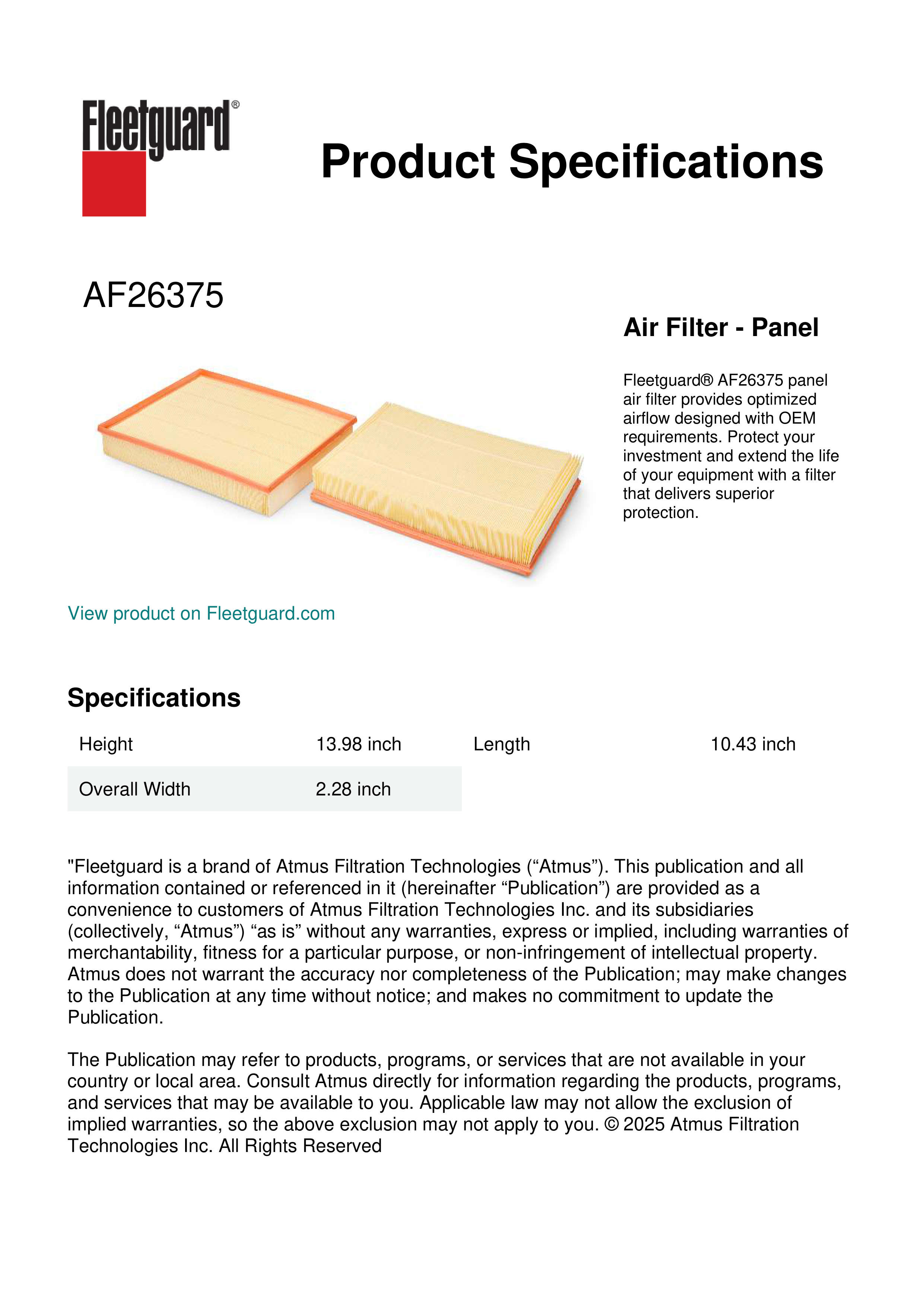 Fleetguard® AF26375 panel air filter provides optimized airflow designed with OEM requirements. Protect your investment and extend the life of your equipment with a filter that delivers superior protection.Specification