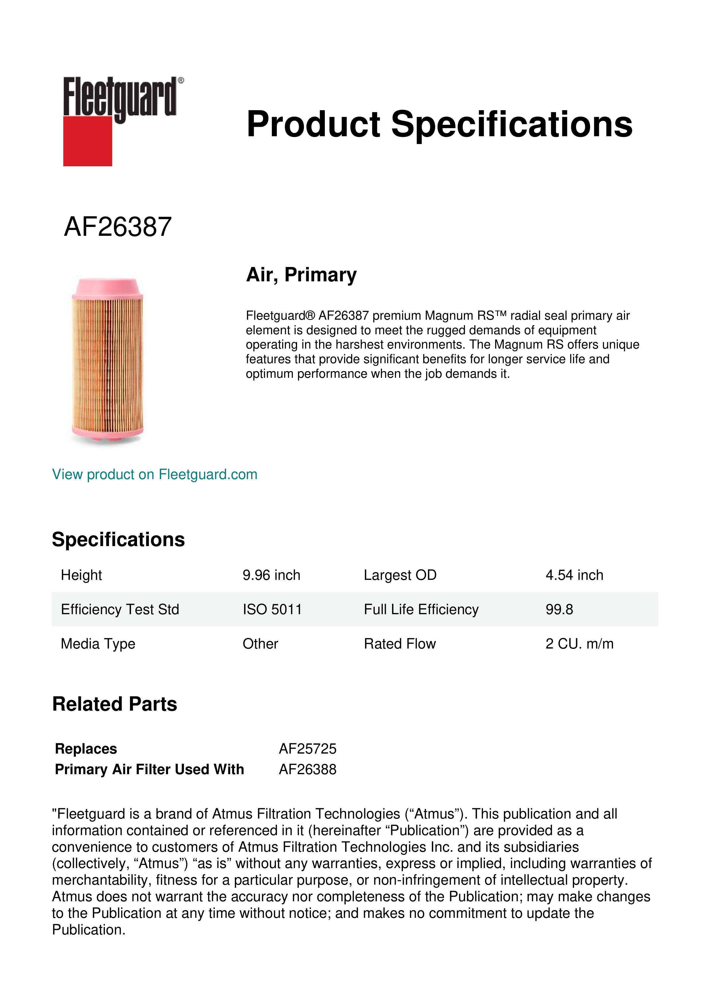 Fleetguard® AF26387 premium Magnum RS™ radial seal primary air element is designed to meet the rugged demands of equipment operating in the harshest environments. The Magnum RS offers unique features that provide significant benefits for longer service life and optimum performance when the job demands it.Specification