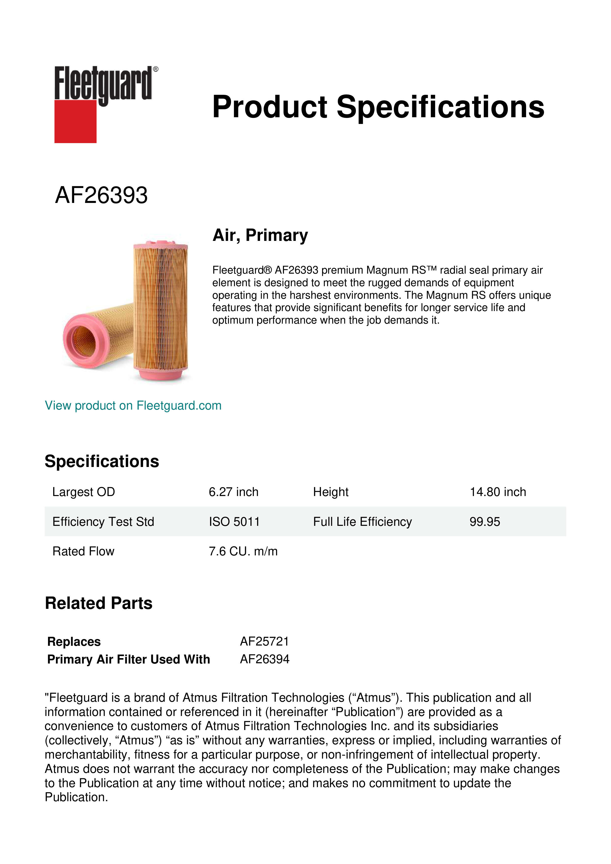 Fleetguard® AF26393 premium Magnum RS™ radial seal primary air element is designed to meet the rugged demands of equipment operating in the harshest environments. The Magnum RS offers unique features that provide significant benefits for longer service life and optimum performance when the job demands it.Specification