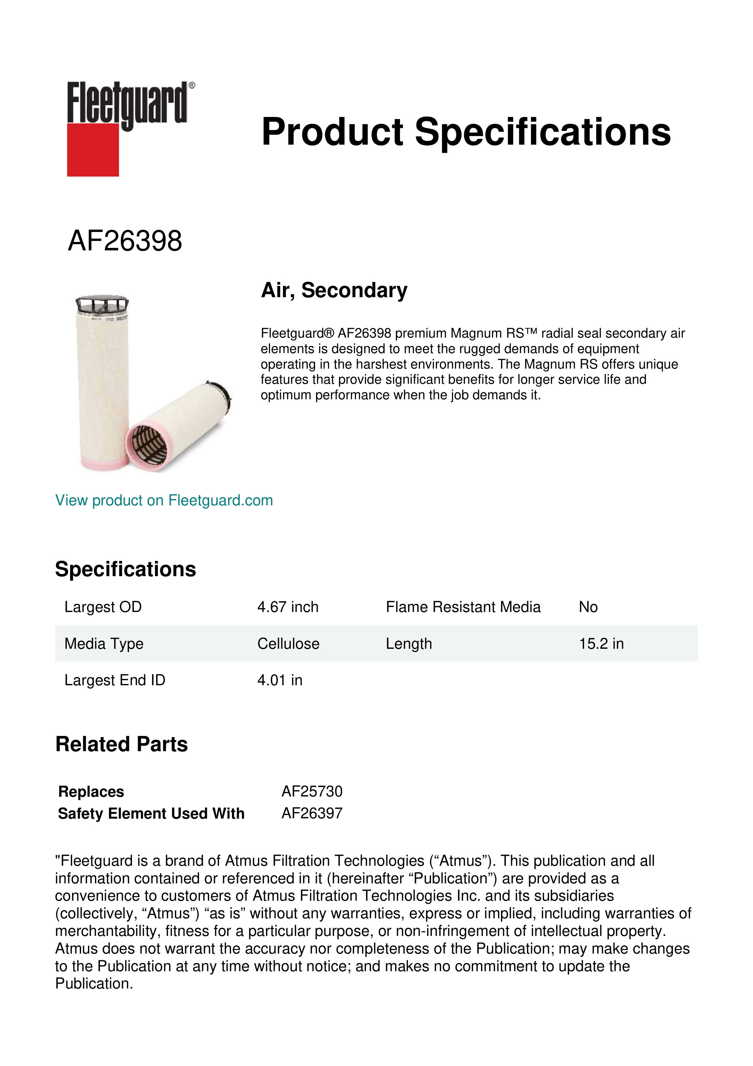 Fleetguard® AF26398 premium Magnum RS™ radial seal secondary air elements is designed to meet the rugged demands of equipment operating in the harshest environments. The Magnum RS offers unique features that provide significant benefits for longer service life and optimum performance when the job demands it.Specification