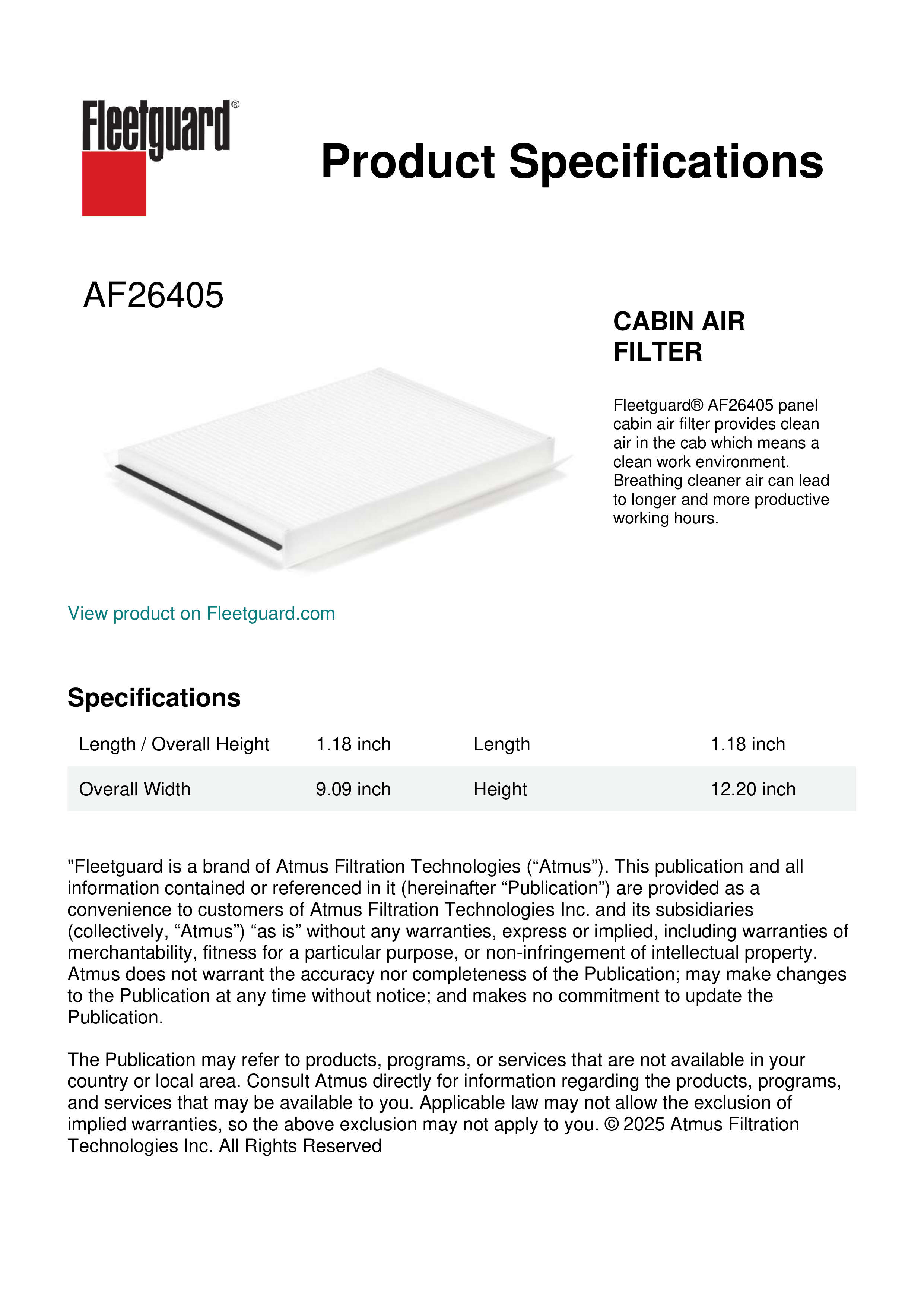 Fleetguard® AF26405 panel cabin air filter provides clean air in the cab which means a clean work environment. Breathing cleaner air can lead to longer and more productive working hours.Specification