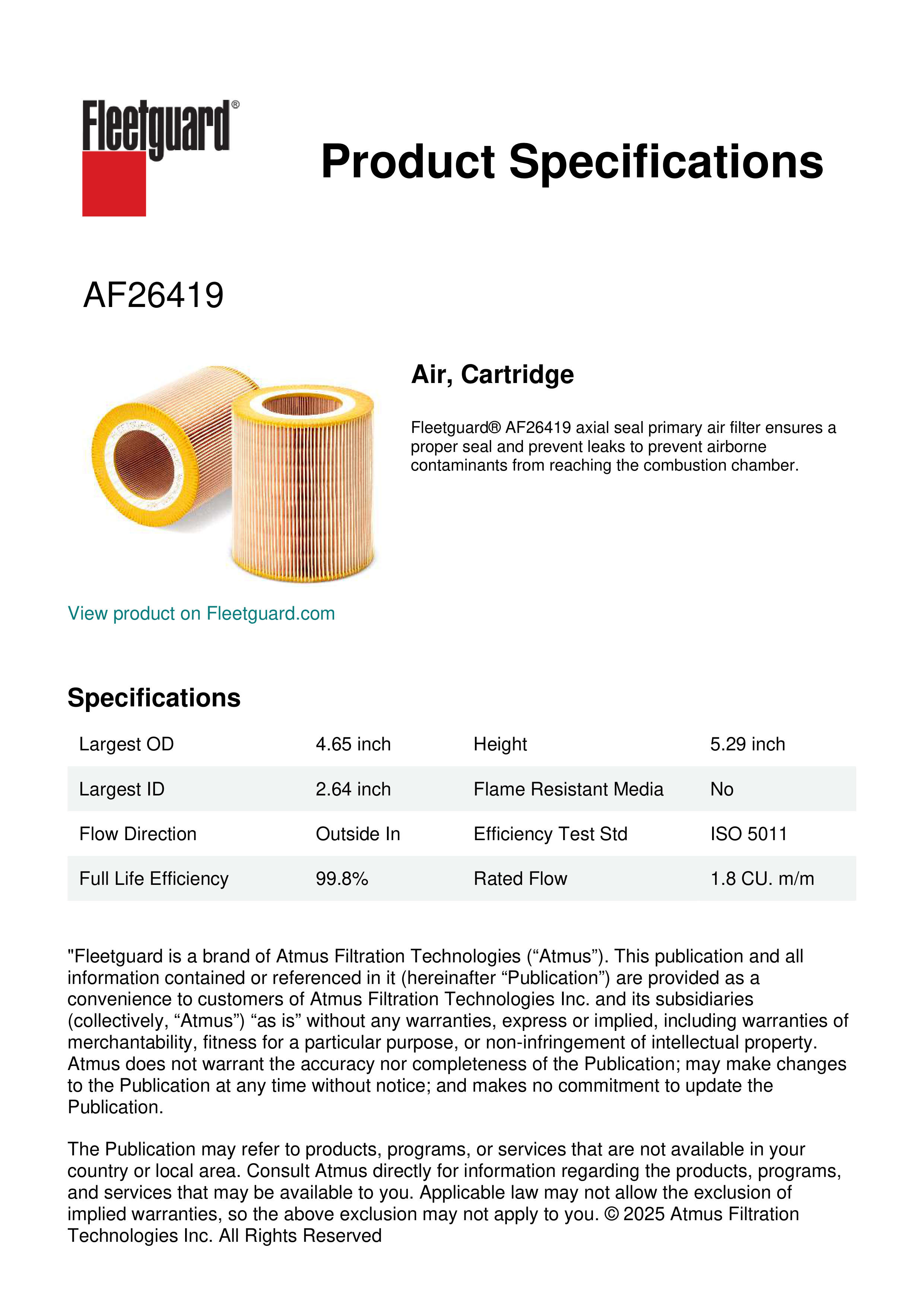 Fleetguard® AF26419 axial seal primary air filter ensures a proper seal and prevent leaks to prevent airborne contaminants from reaching the combustion chamber.Specification