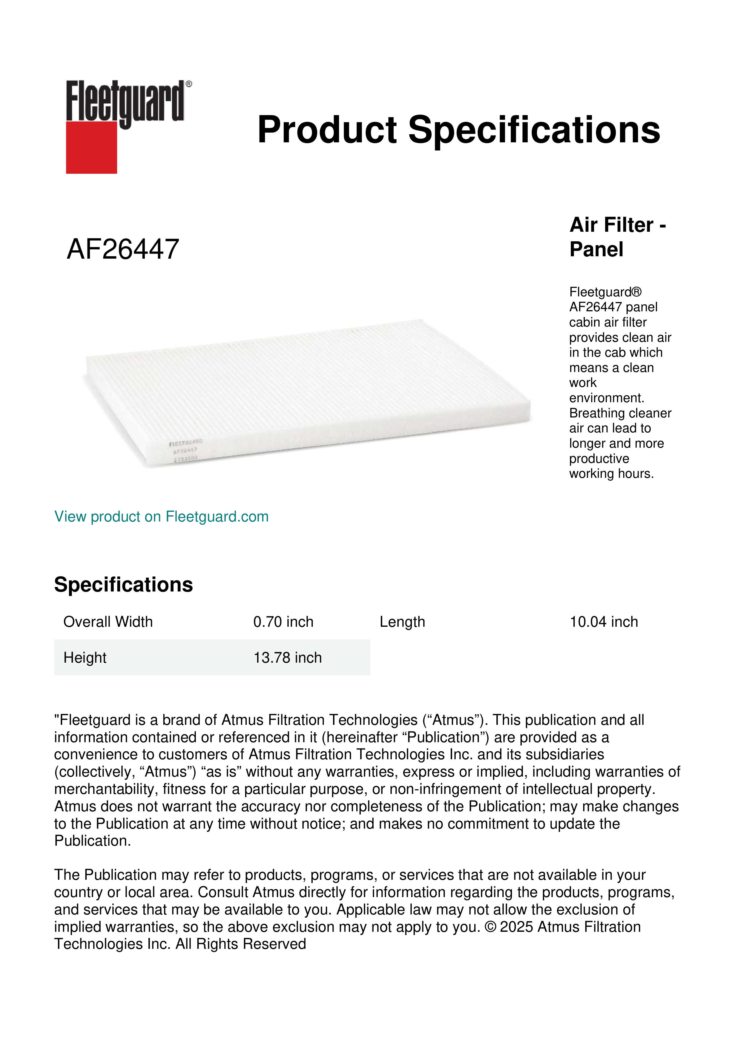 Fleetguard® AF26447 panel cabin air filter provides clean air in the cab which means a clean work environment. Breathing cleaner air can lead to longer and more productive working hours.Specification