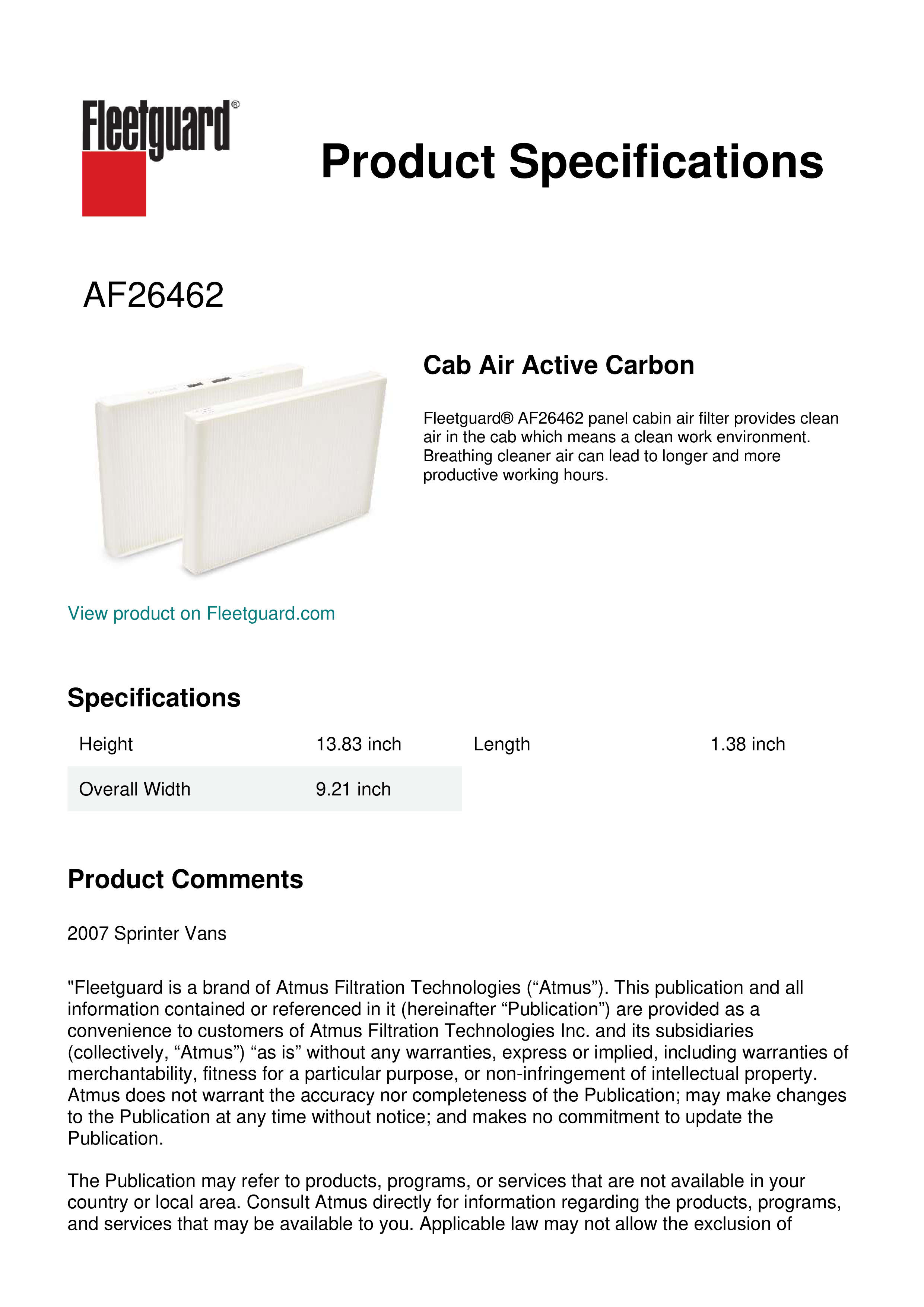 Fleetguard® AF26462 panel cabin air filter provides clean air in the cab which means a clean work environment. Breathing cleaner air can lead to longer and more productive working hours.Specification
