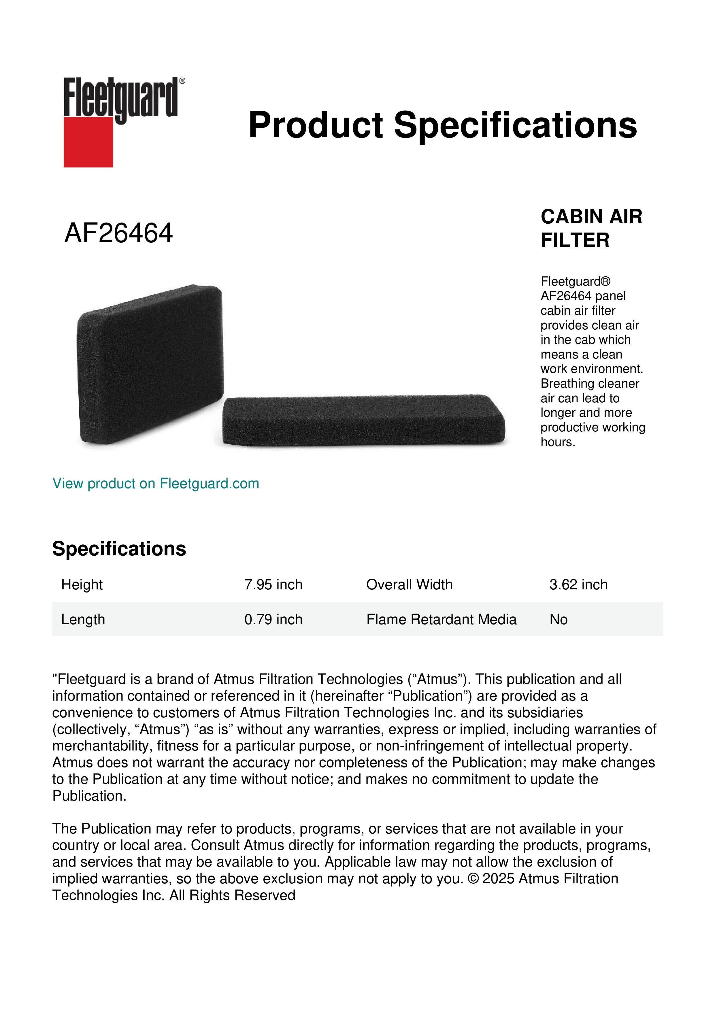 Fleetguard® AF26464 panel cabin air filter provides clean air in the cab which means a clean work environment. Breathing cleaner air can lead to longer and more productive working hours.Specification