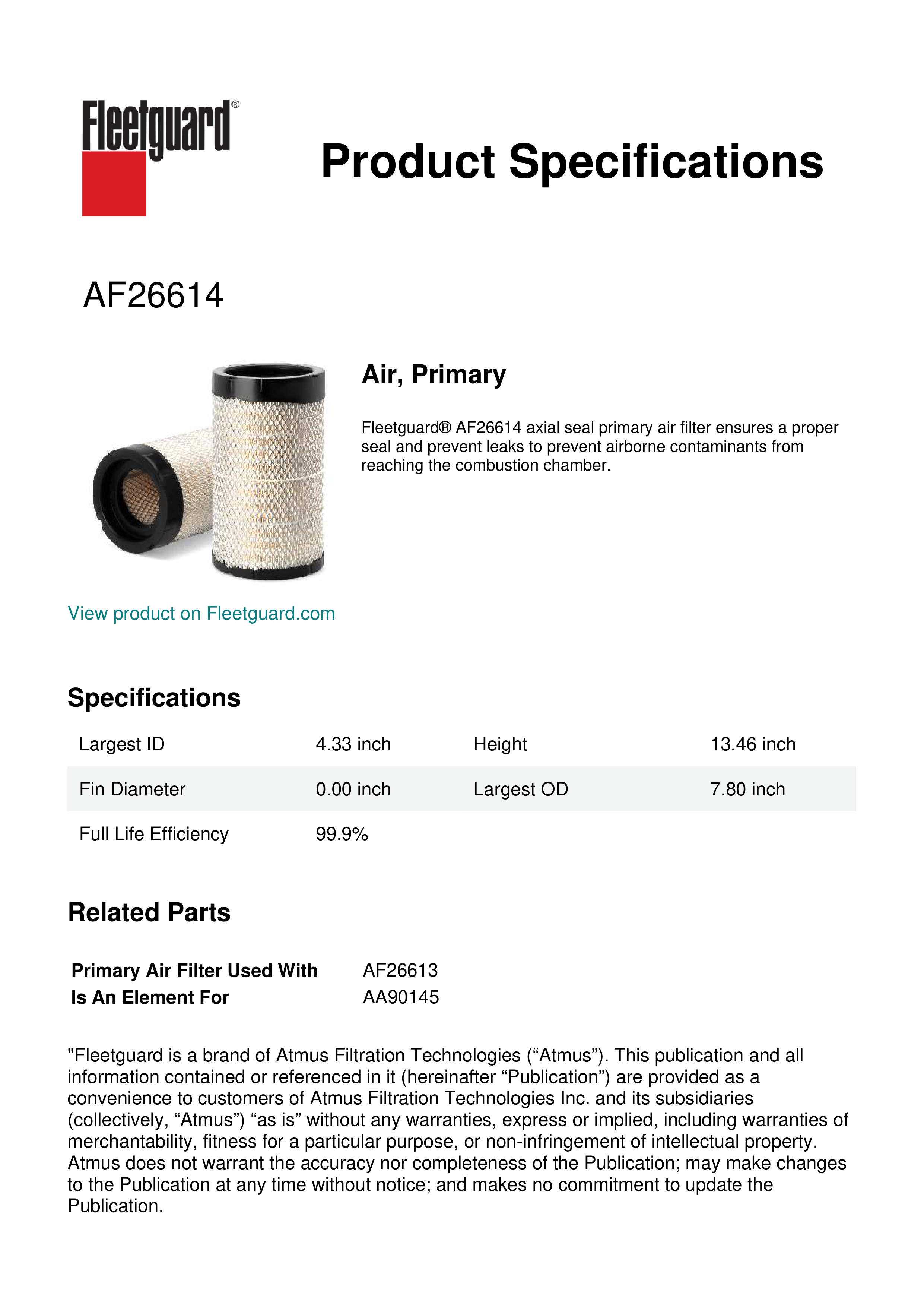 Fleetguard® AF26614 axial seal primary air filter ensures a proper seal and prevent leaks to prevent airborne contaminants from reaching the combustion chamber.