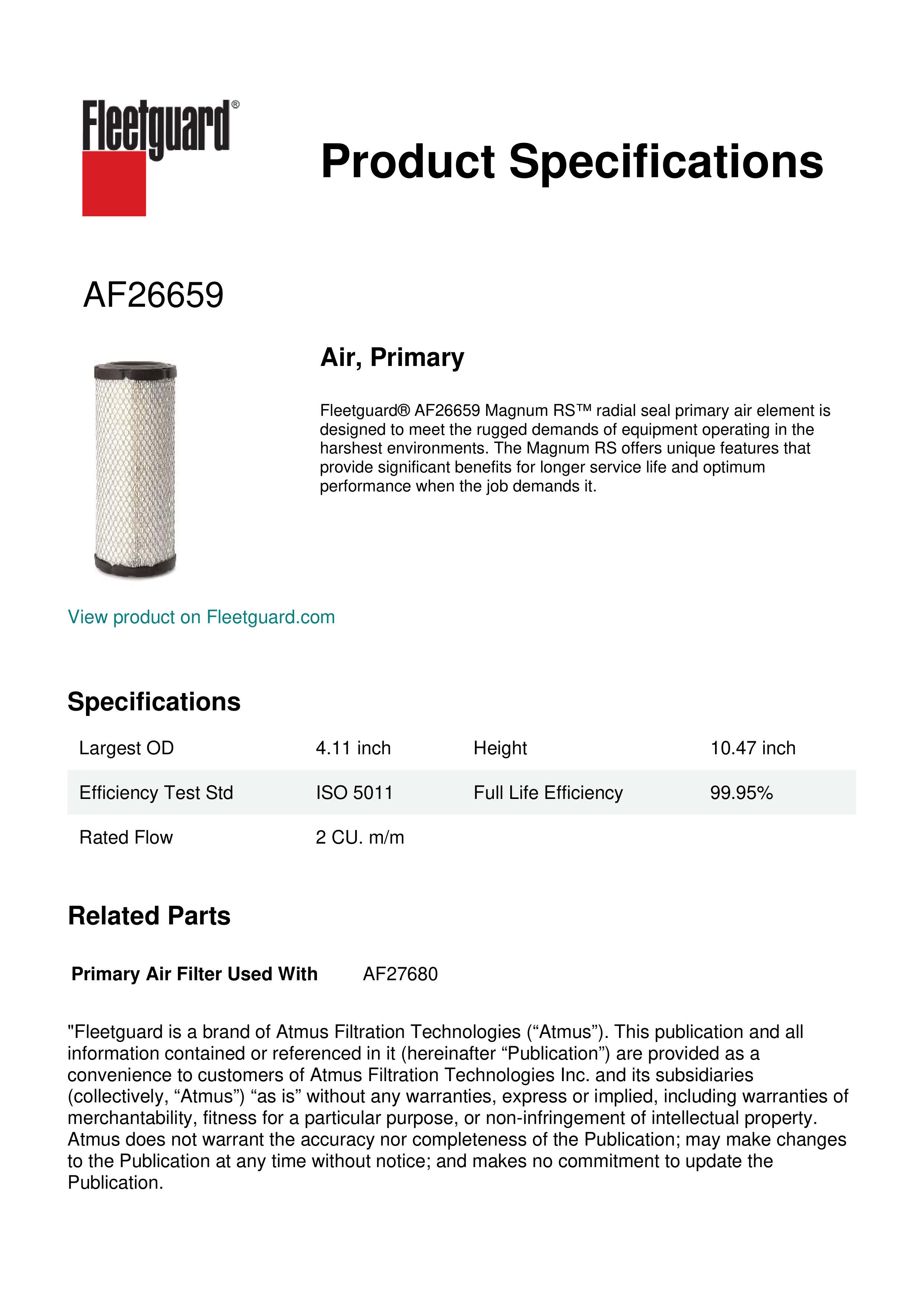 Fleetguard® AF26659 Magnum RS™ radial seal primary air element is designed to meet the rugged demands of equipment operating in the harshest environments. The Magnum RS offers unique features that provide significant benefits for longer service life and optimum performance when the job demands it.Specification