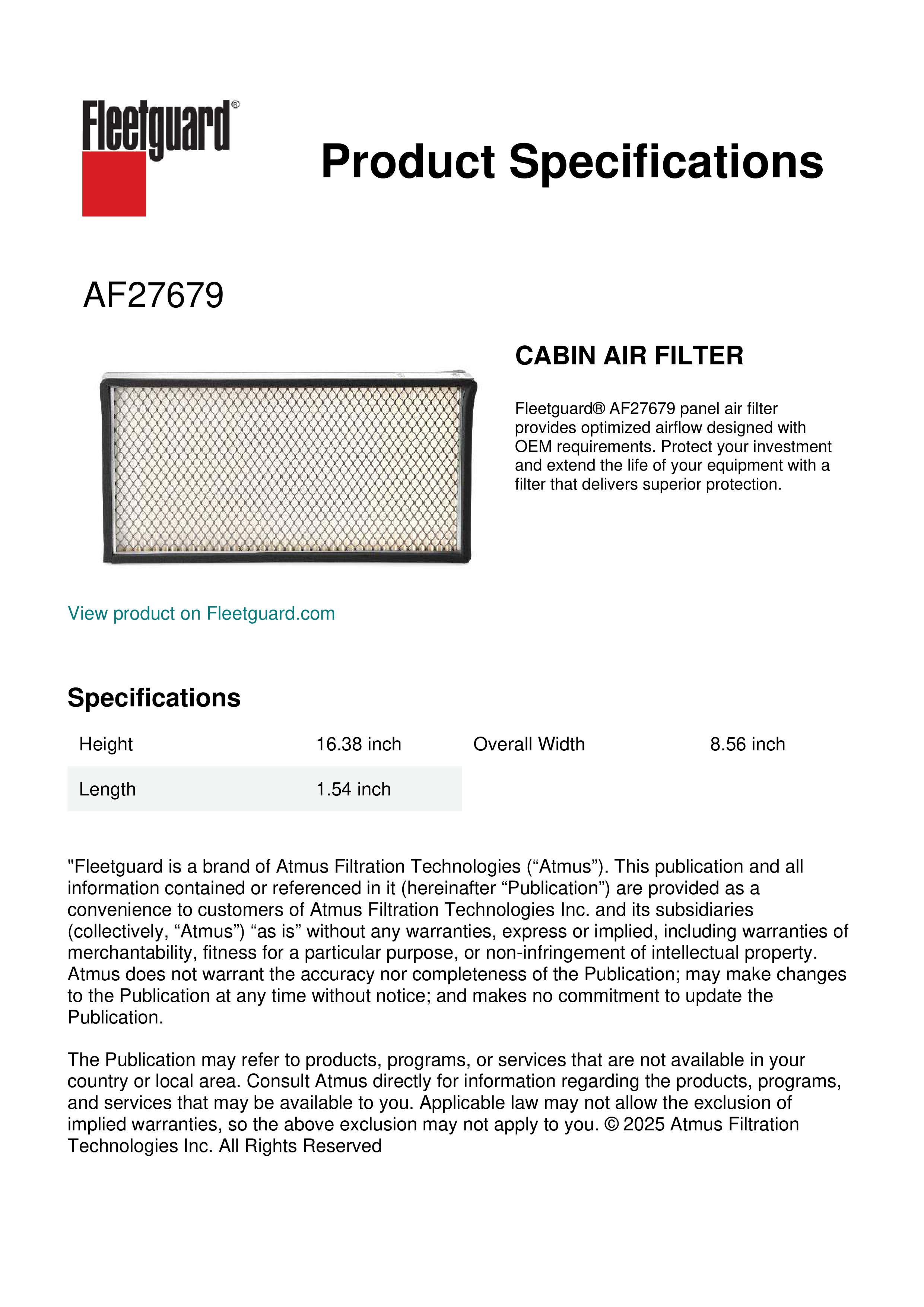 Fleetguard® AF27679 panel air filter provides optimized airflow designed with OEM requirements. Protect your investment and extend the life of your equipment with a filter that delivers superior protection.Specification