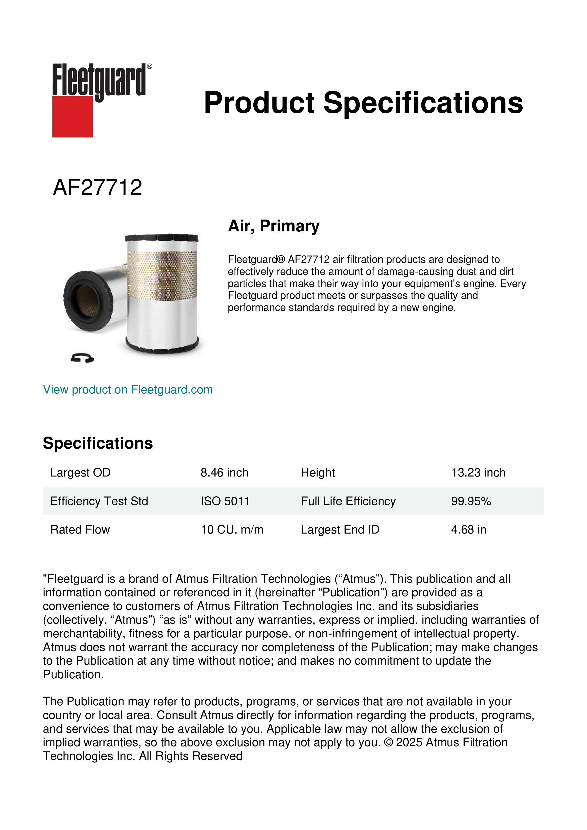 Fleetguard® AF27712 air filtration products are designed to effectively reduce the amount of damage-causing dust and dirt particles that make their way into your equipment’s engine. Every Fleetguard product meets or surpasses the quality and performance standards required by a new engine.Specification