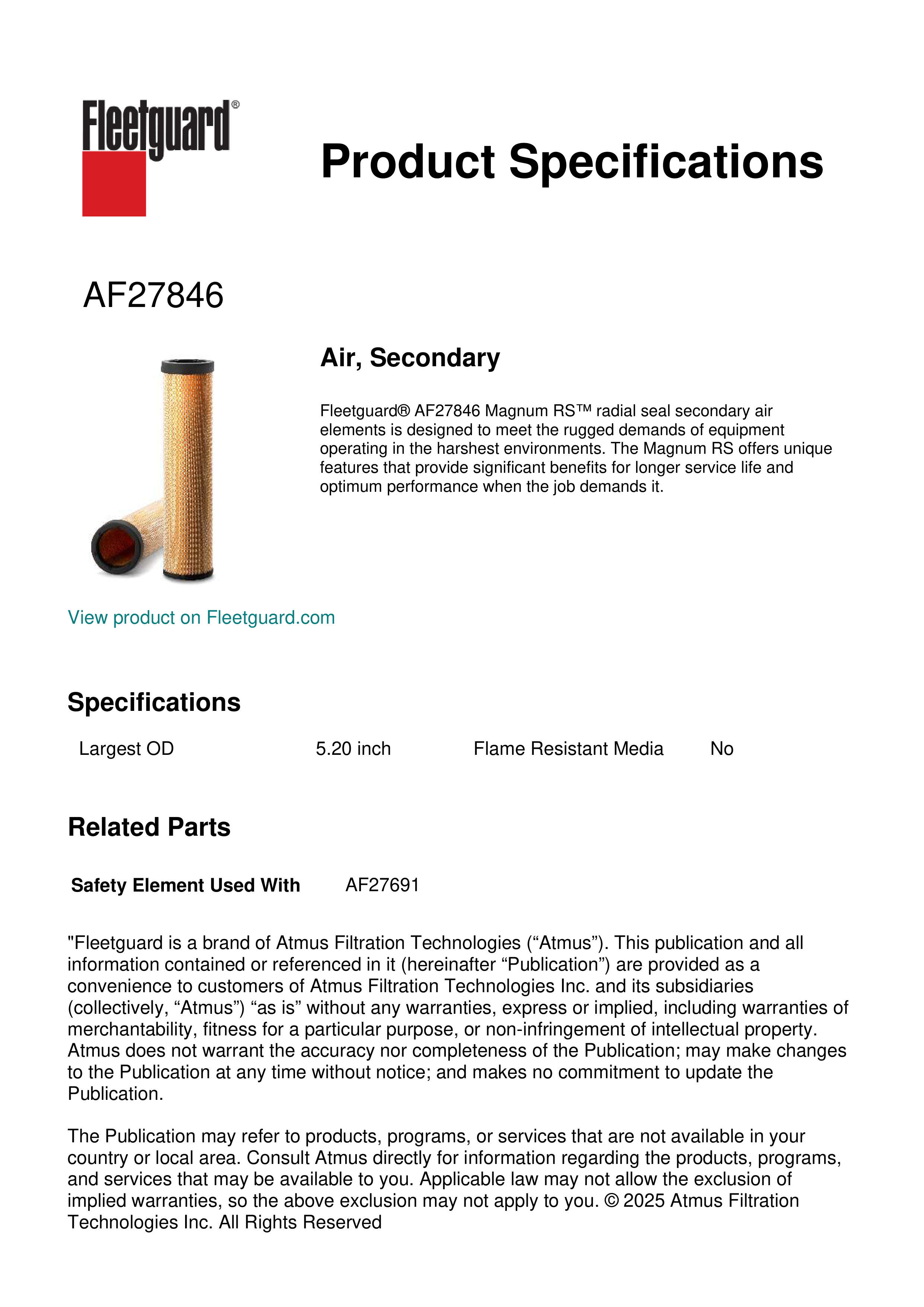 Fleetguard® AF27846 Magnum RS™ radial seal secondary air elements is designed to meet the rugged demands of equipment operating in the harshest environments. The Magnum RS offers unique features that provide significant benefits for longer service life and optimum performance when the job demands it.Specification