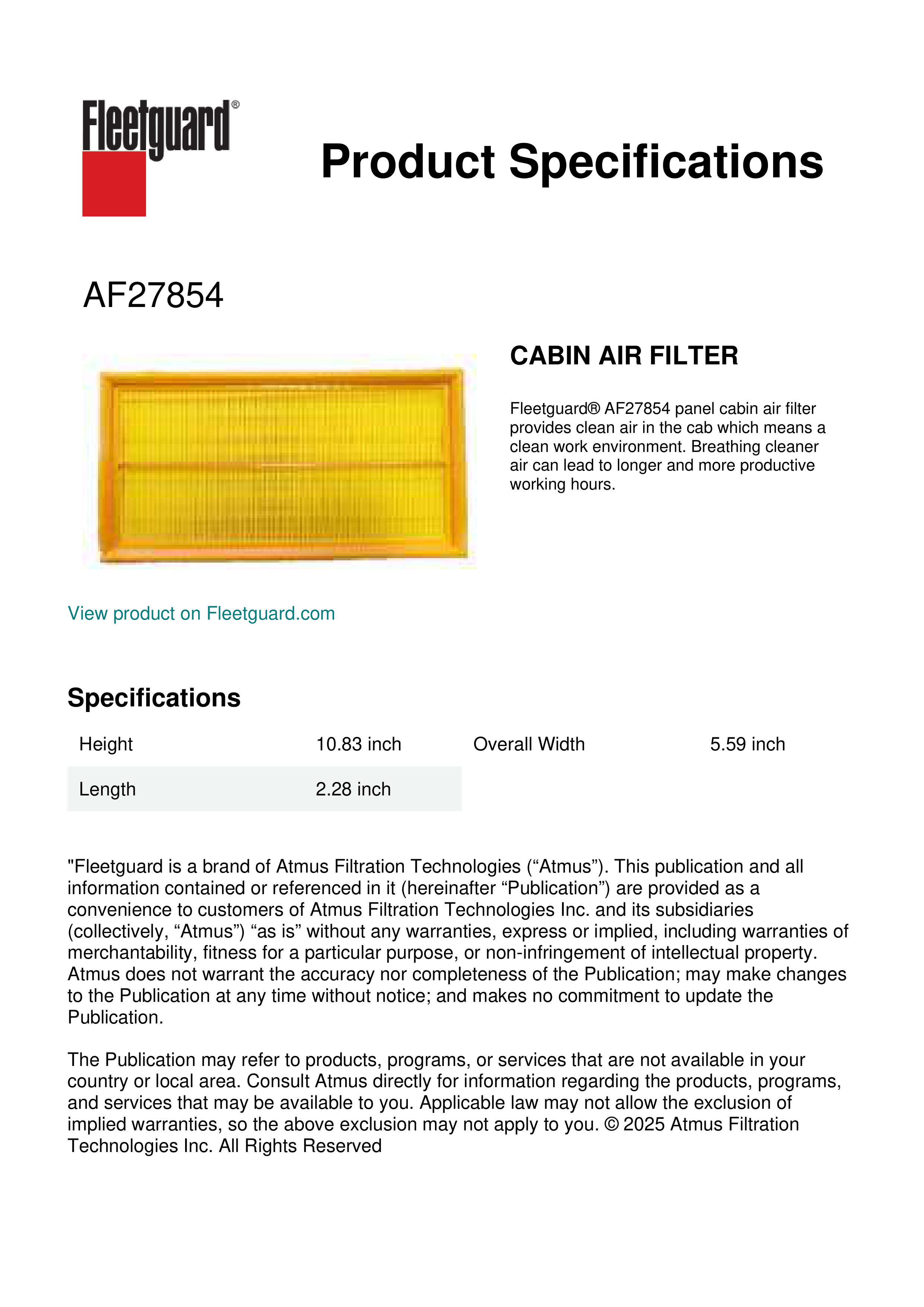 Fleetguard® AF27854 panel cabin air filter provides clean air in the cab which means a clean work environment. Breathing cleaner air can lead to longer and more productive working hours.Specification