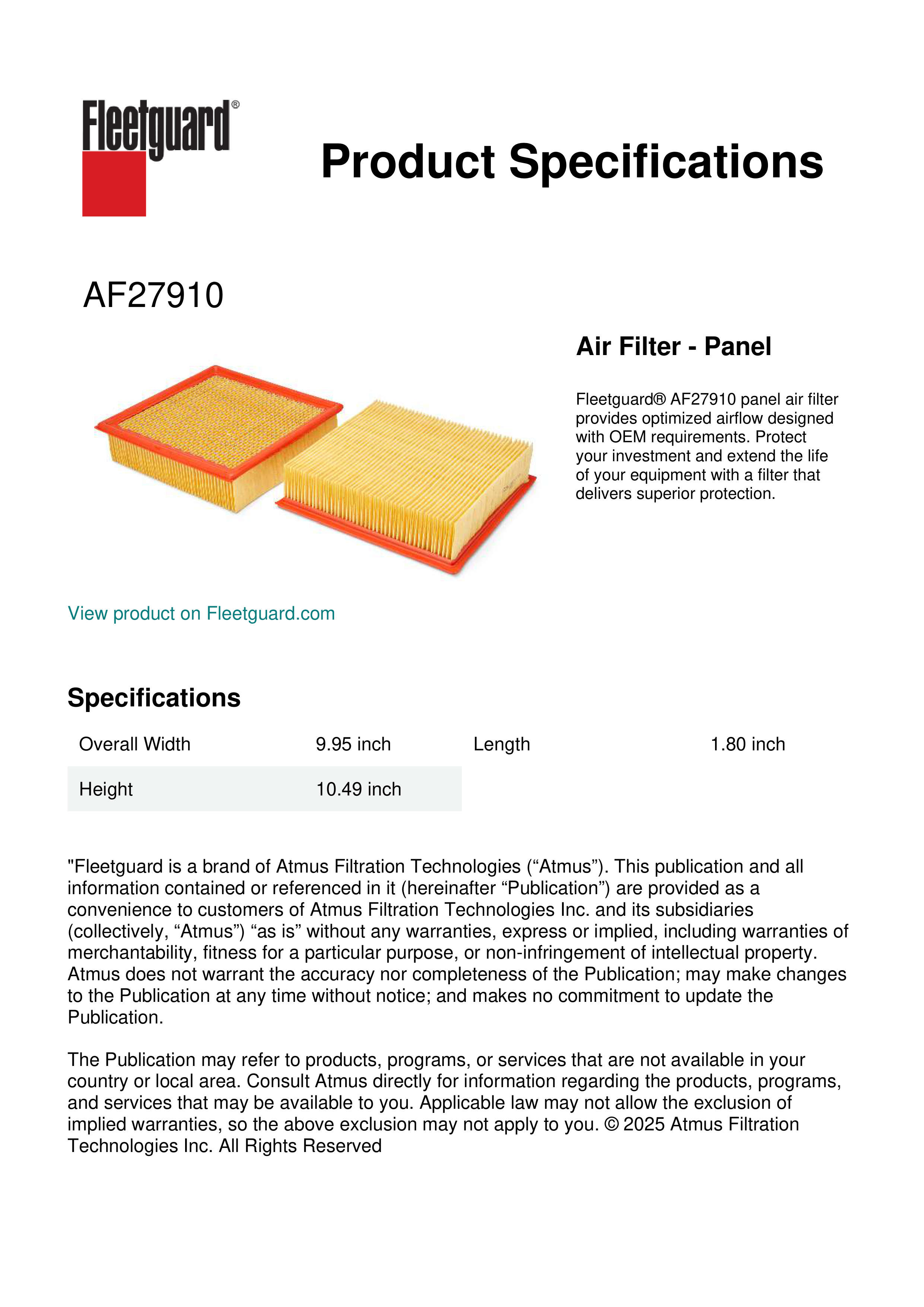 Fleetguard® AF27910 panel air filter provides optimized airflow designed with OEM requirements. Protect your investment and extend the life of your equipment with a filter that delivers superior protection.Specification