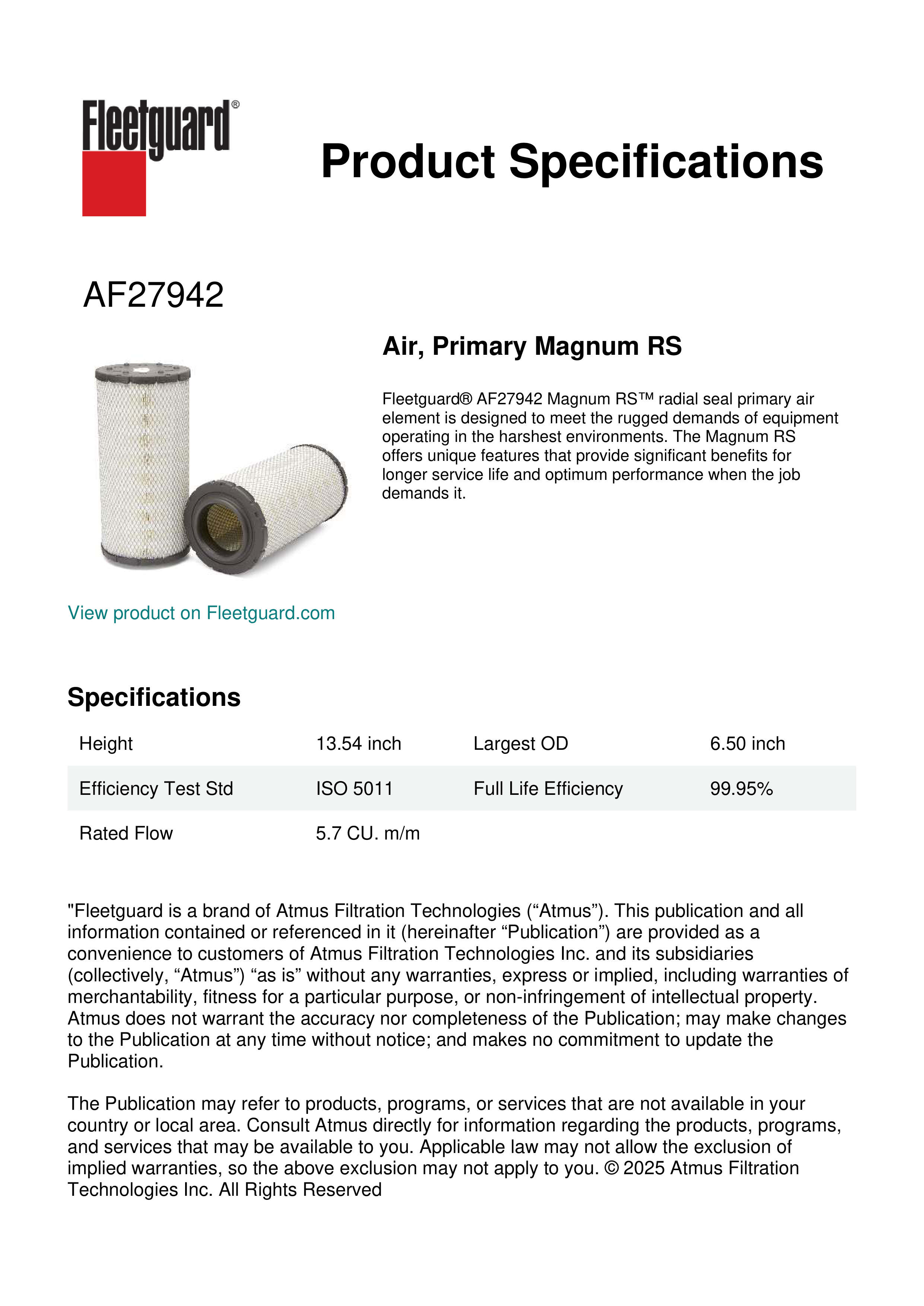 Fleetguard® AF27942 Magnum RS™ radial seal primary air element is designed to meet the rugged demands of equipment operating in the harshest environments. The Magnum RS offers unique features that provide significant benefits for longer service life and optimum performance when the job demands it.Specification