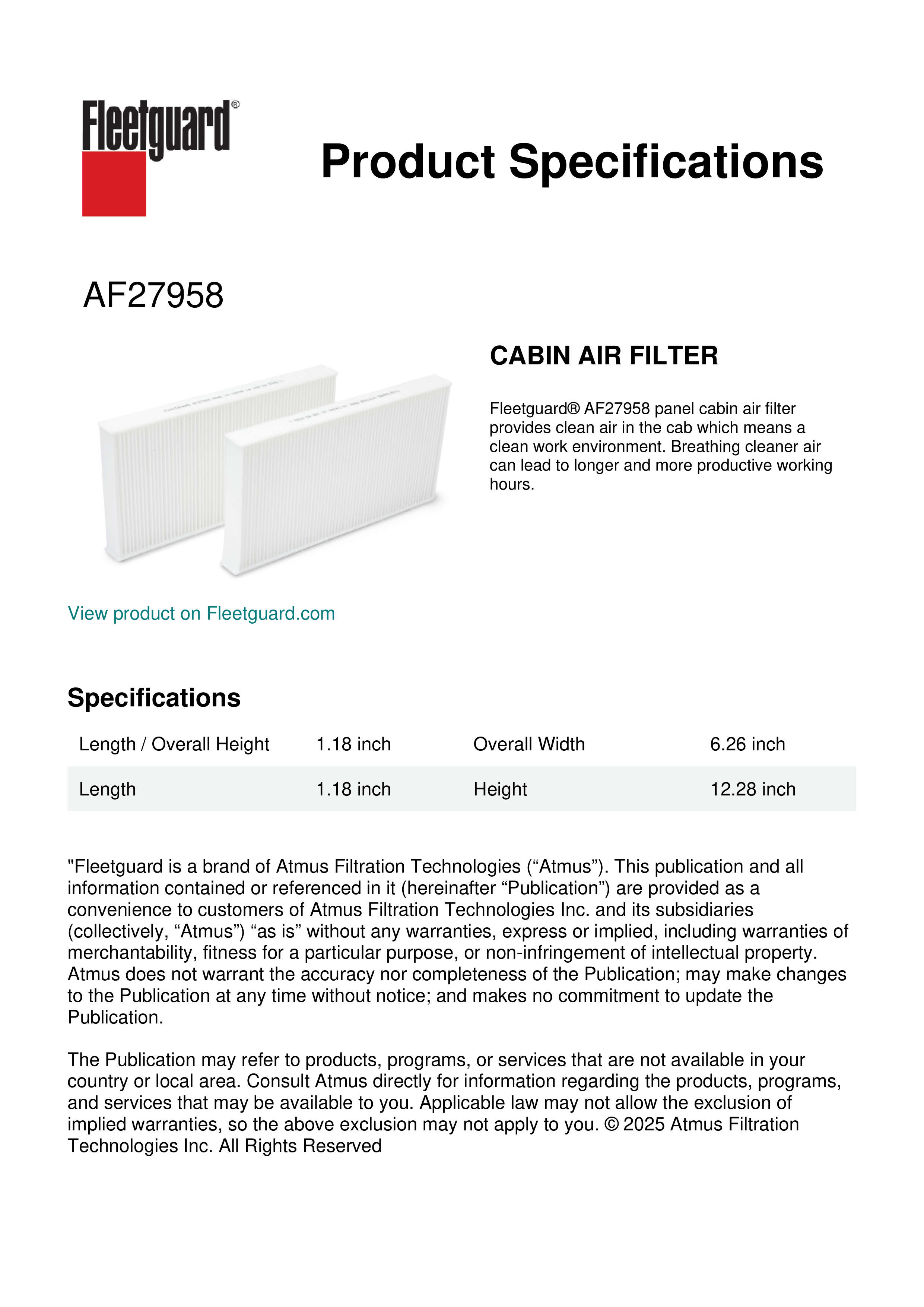 Fleetguard® AF27958 panel cabin air filter provides clean air in the cab which means a clean work environment. Breathing cleaner air can lead to longer and more productive working hours.Specification