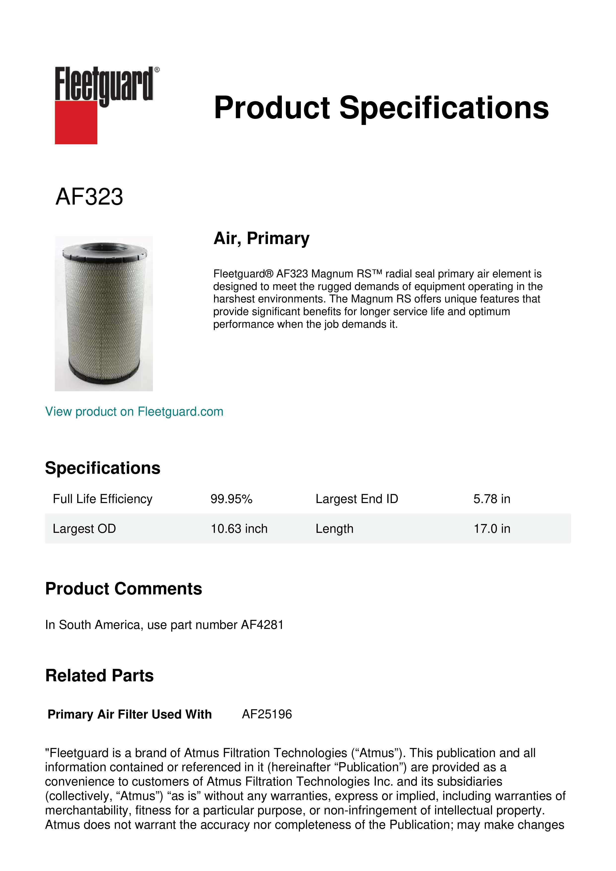 Fleetguard® AF323 Magnum RS™ radial seal primary air element is designed to meet the rugged demands of equipment operating in the harshest environments. The Magnum RS offers unique features that provide significant benefits for longer service life and optimum performance when the job demands it.Specification