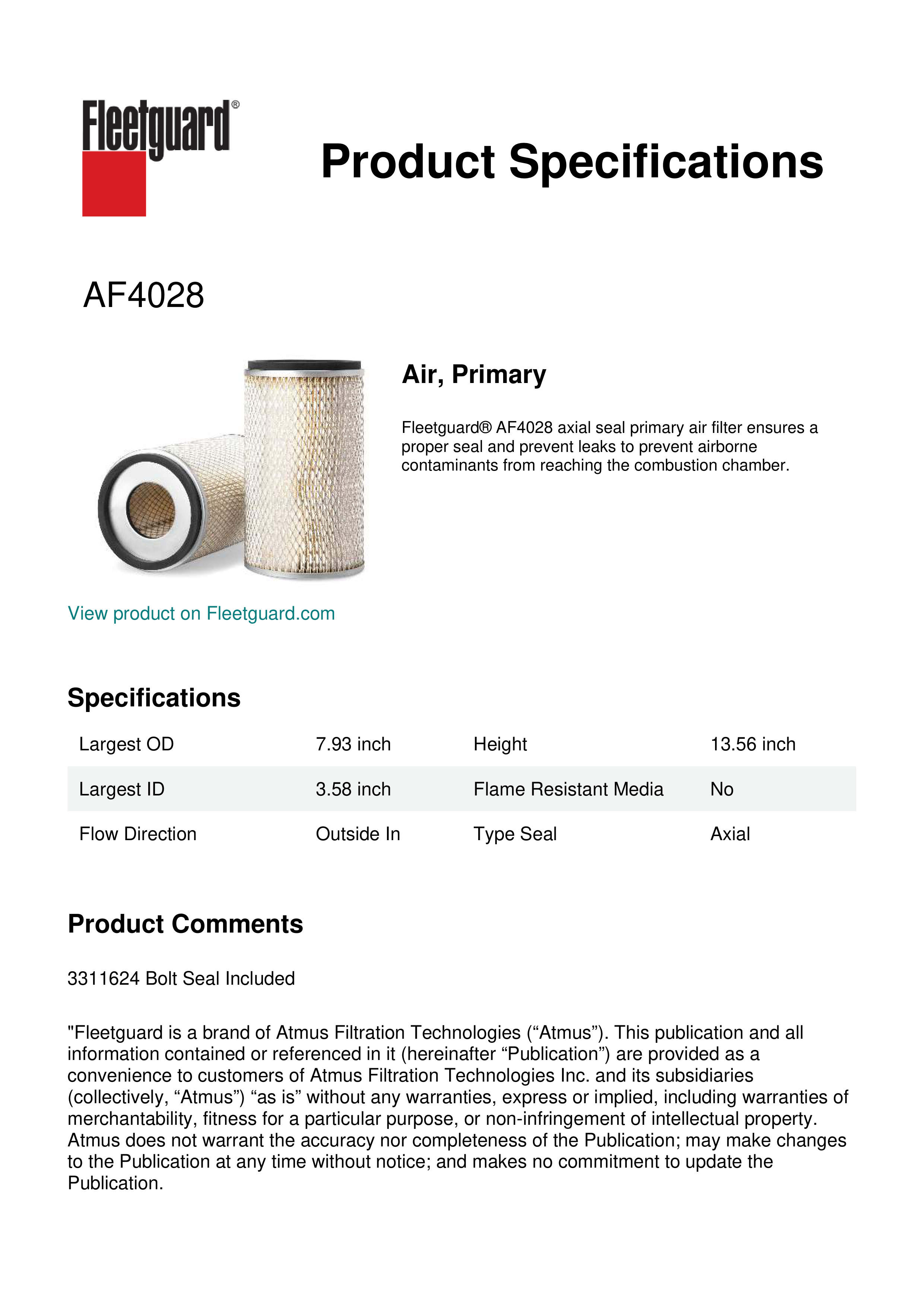 Fleetguard® AF4028 axial seal primary air filter ensures a proper seal and prevent leaks to prevent airborne contaminants from reaching the combustion chamber.