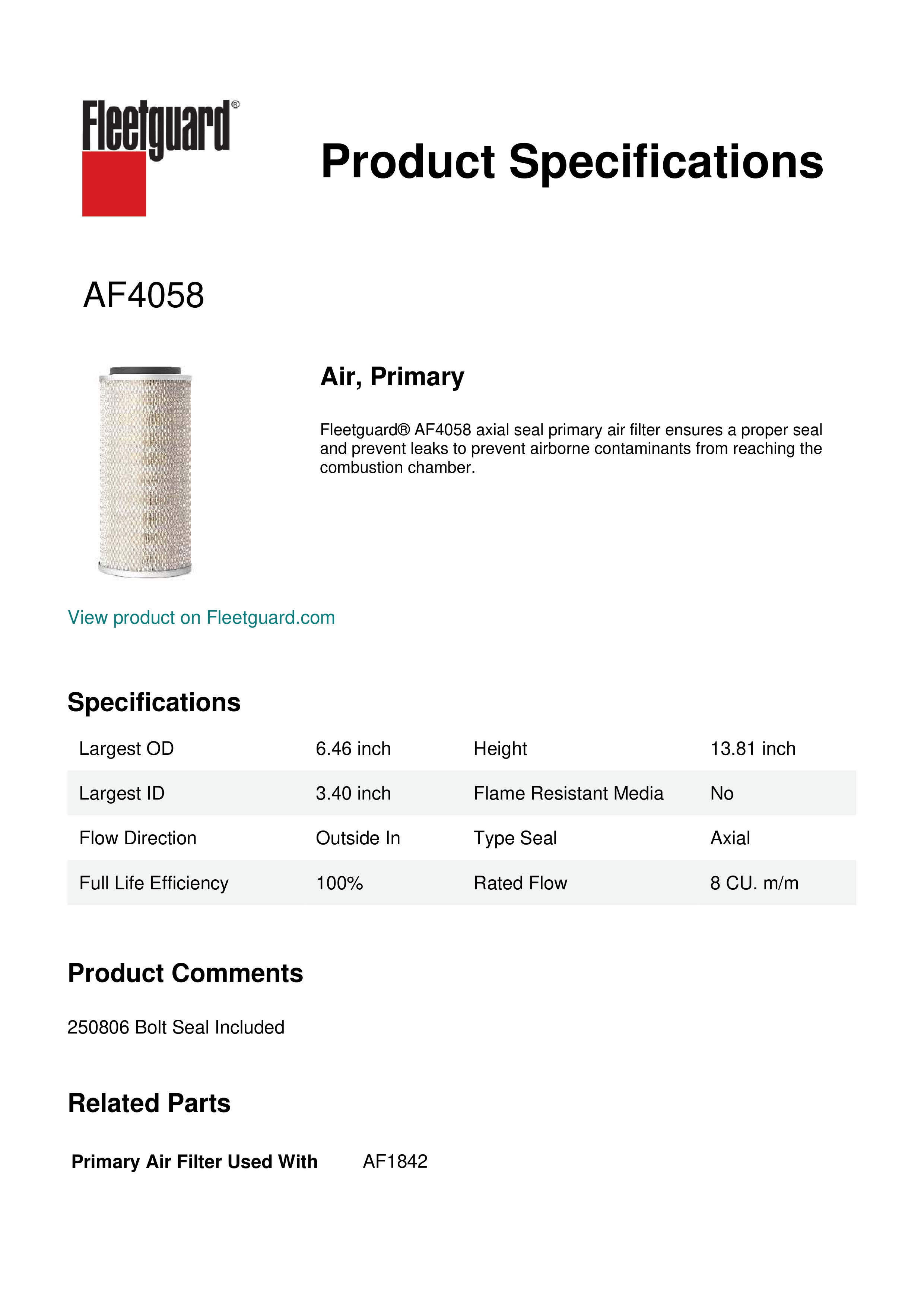 Fleetguard® AF4058 axial seal primary air filter ensures a proper seal and prevent leaks to prevent airborne contaminants from reaching the combustion chamber.