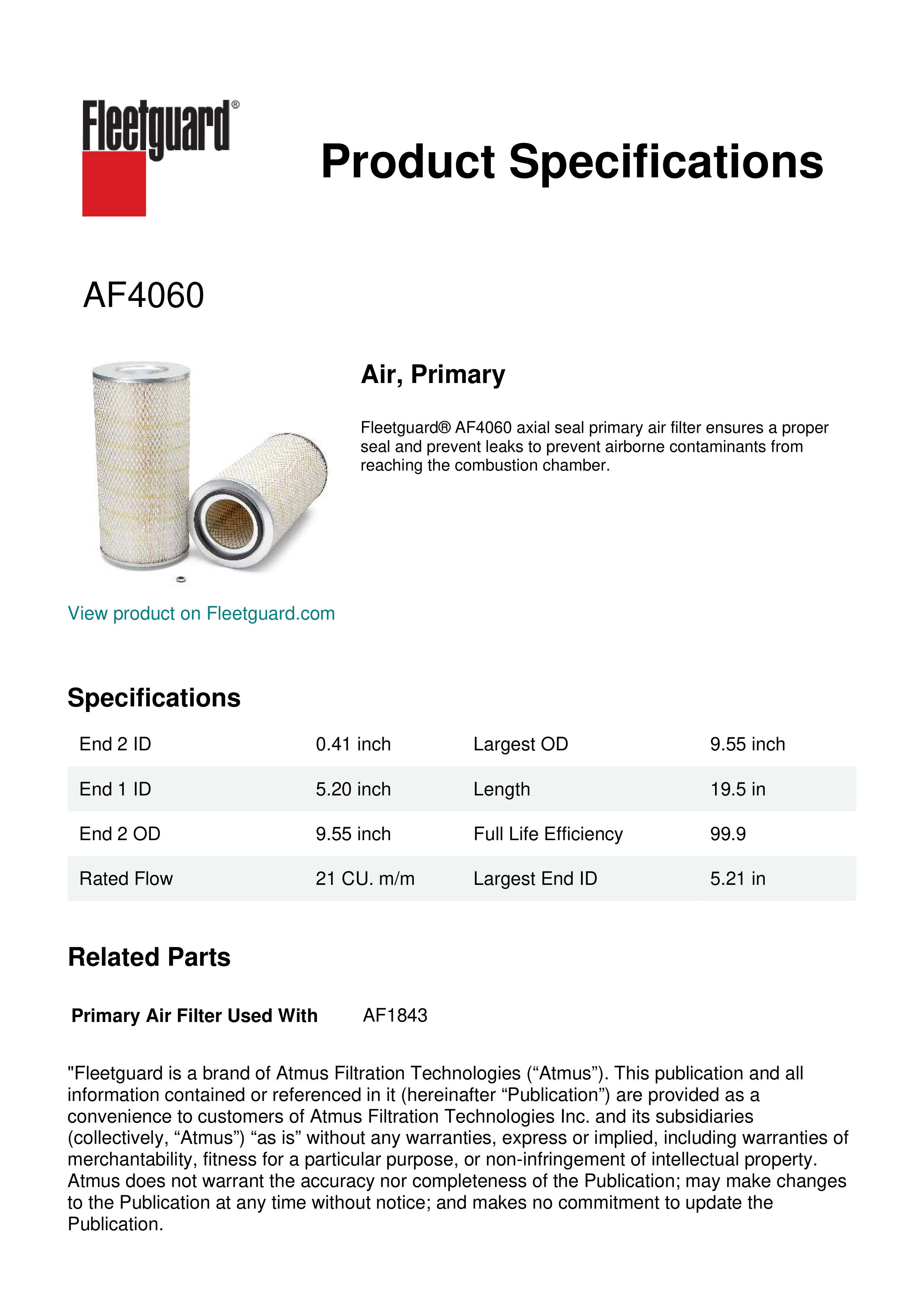 Fleetguard® AF4060 axial seal primary air filter ensures a proper seal and prevent leaks to prevent airborne contaminants from reaching the combustion chamber.Specification
