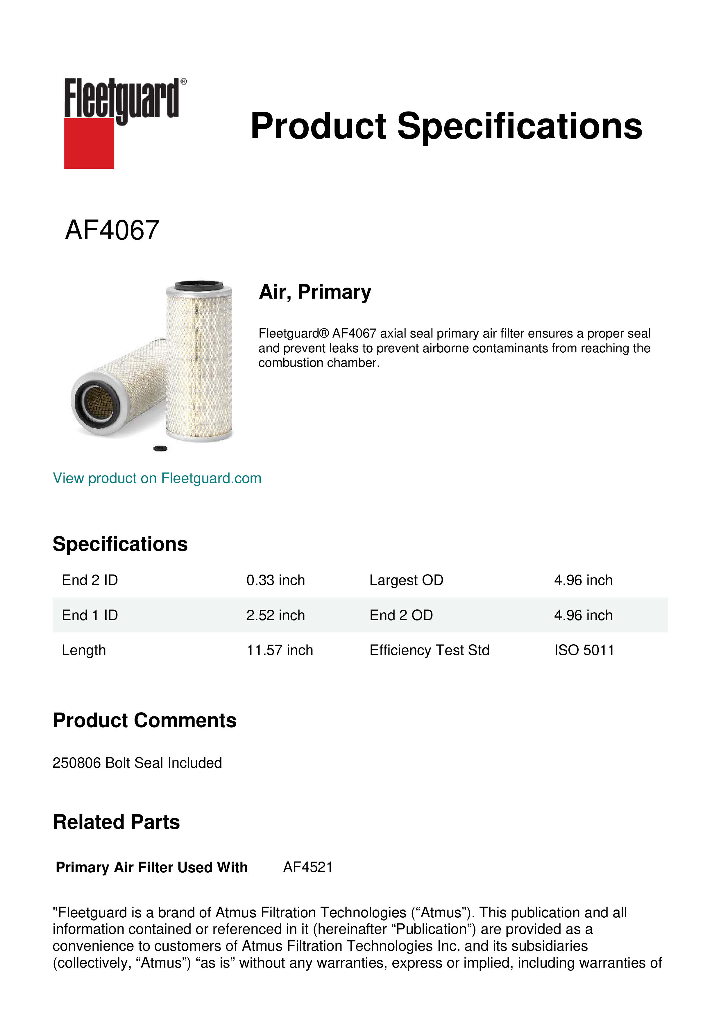 Fleetguard® AF4067 axial seal primary air filter ensures a proper seal and prevent leaks to prevent airborne contaminants from reaching the combustion chamber.