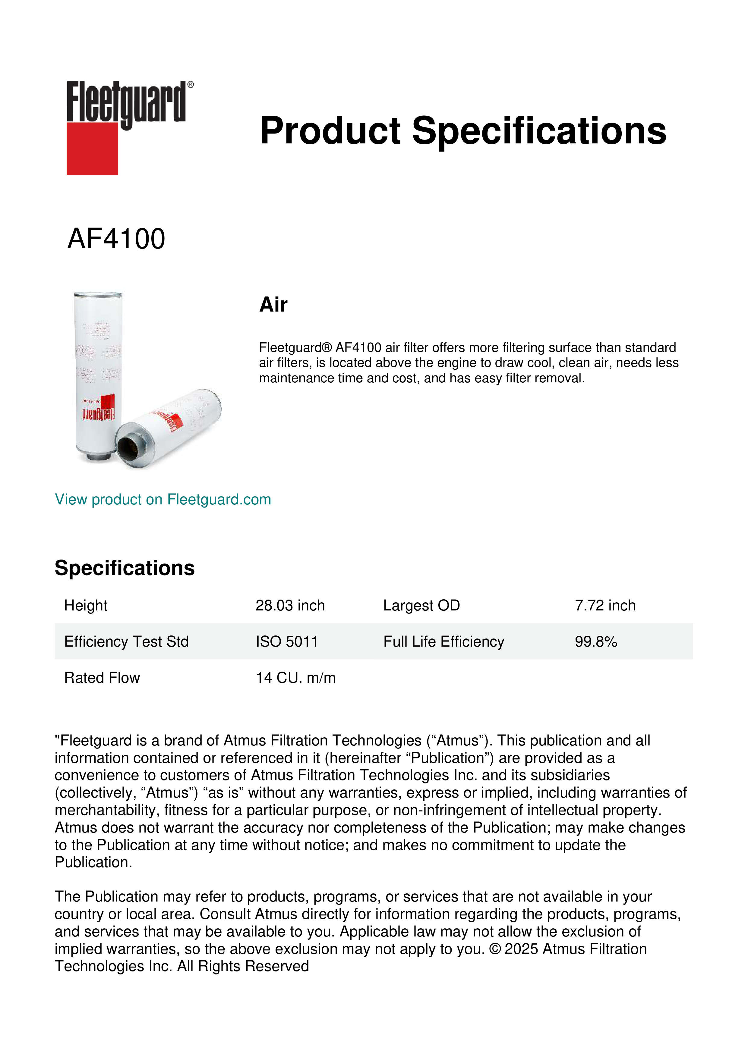 Fleetguard® AF4100 air filter offers more filtering surface than standard air filters, is located above the engine to draw cool, clean air, needs less maintenance time and cost, and has easy filter removal.Specification