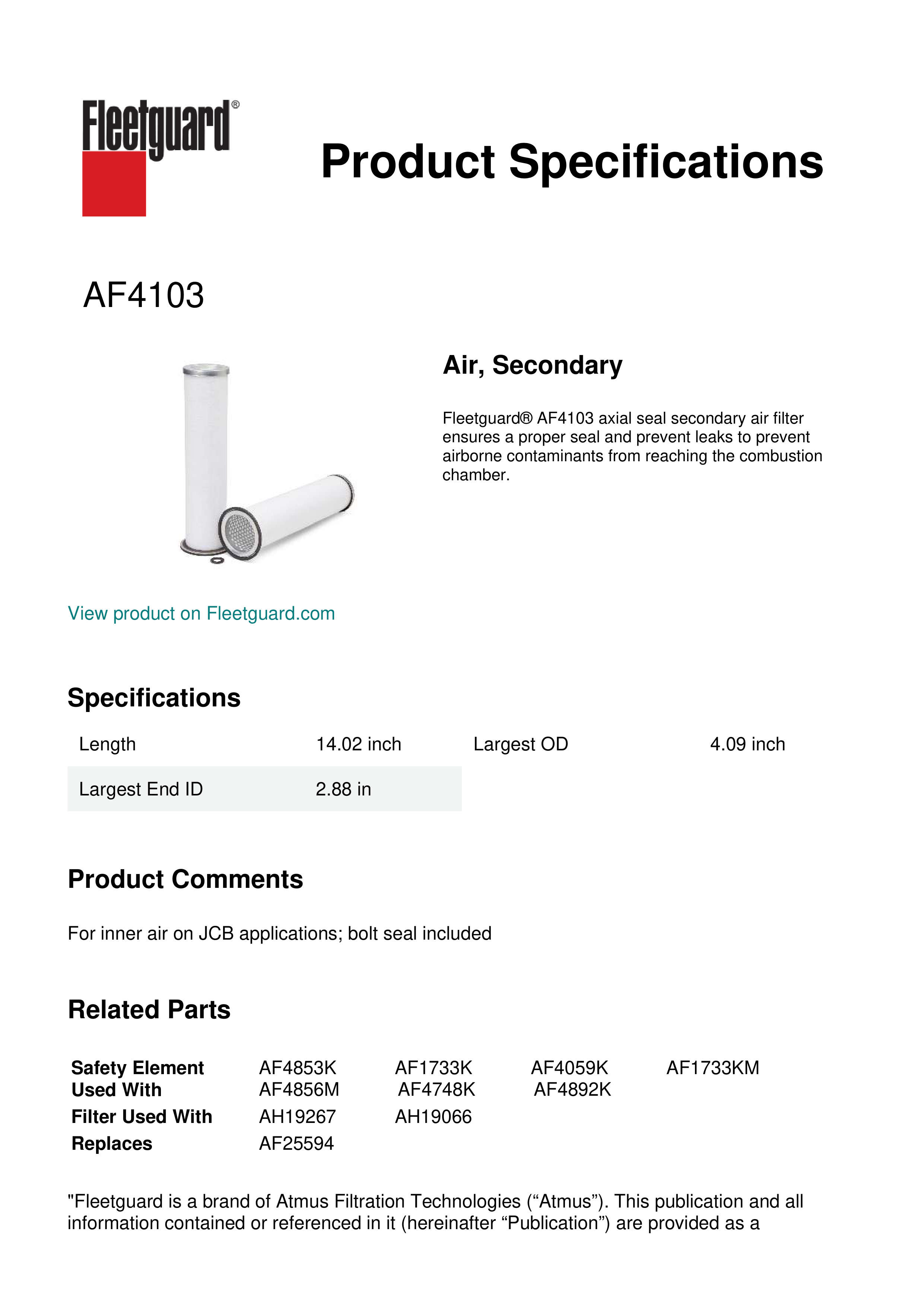 Fleetguard® AF4103 axial seal secondary air filter ensures a proper seal and prevent leaks to prevent airborne contaminants from reaching the combustion chamber.Specification