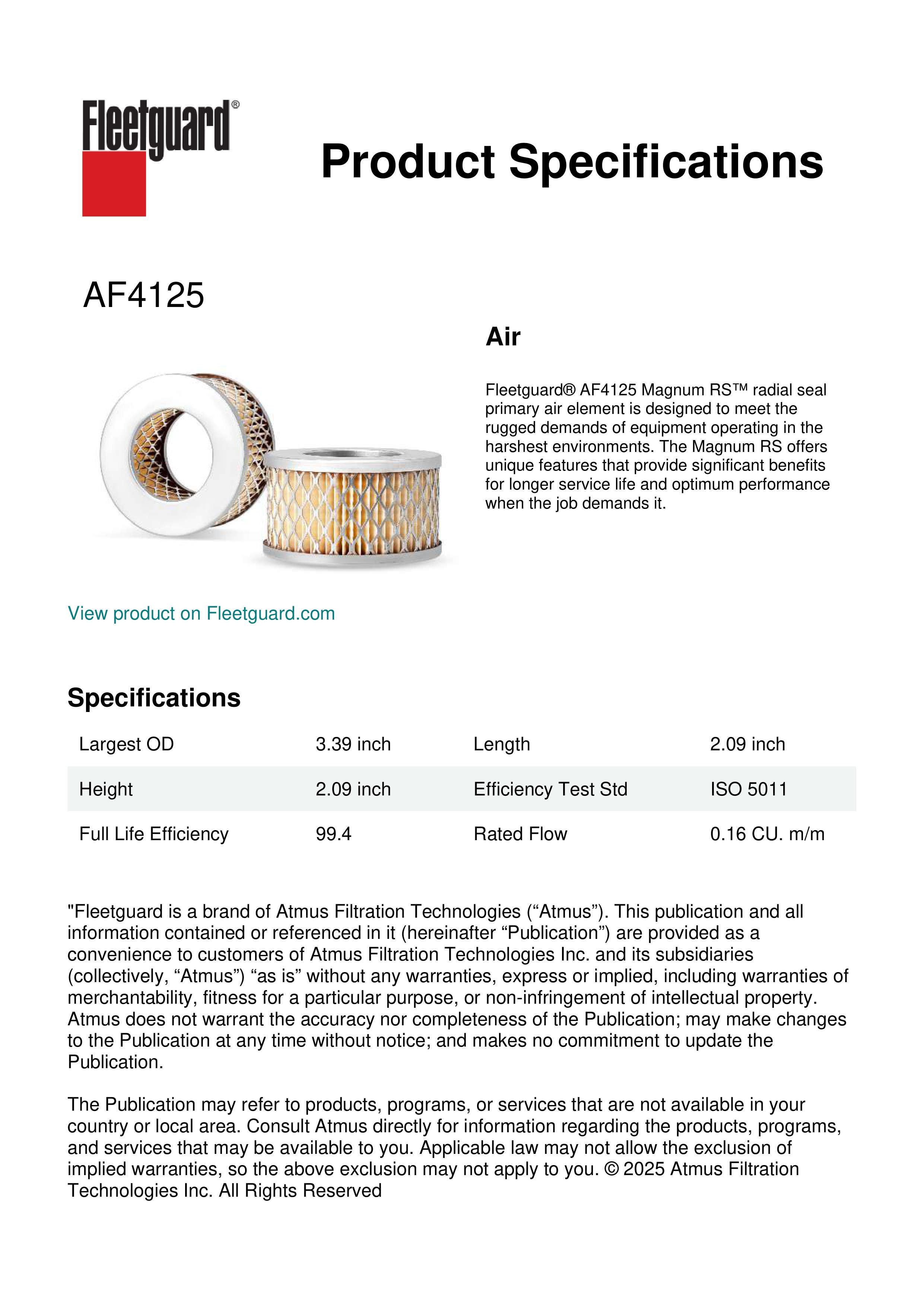 Fleetguard® AF4125 Magnum RS™ radial seal primary air element is designed to meet the rugged demands of equipment operating in the harshest environments. The Magnum RS offers unique features that provide significant benefits for longer service life and optimum performance when the job demands it.Specification